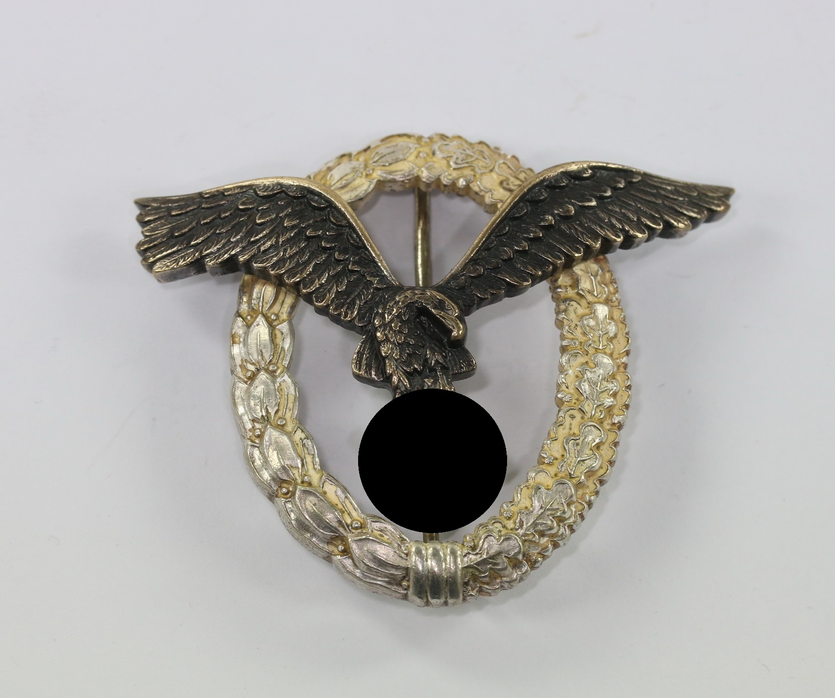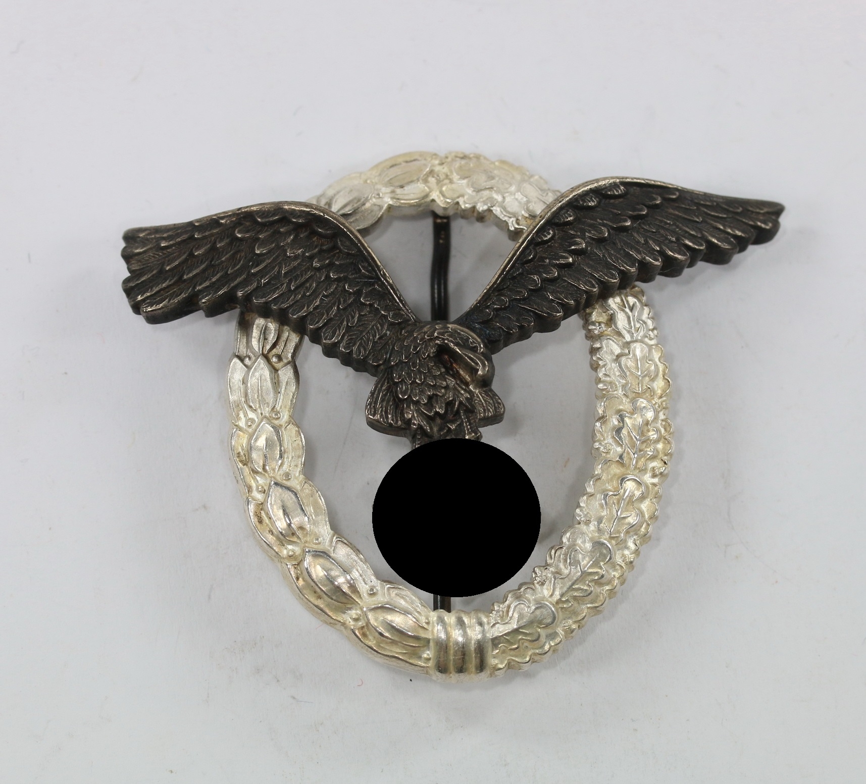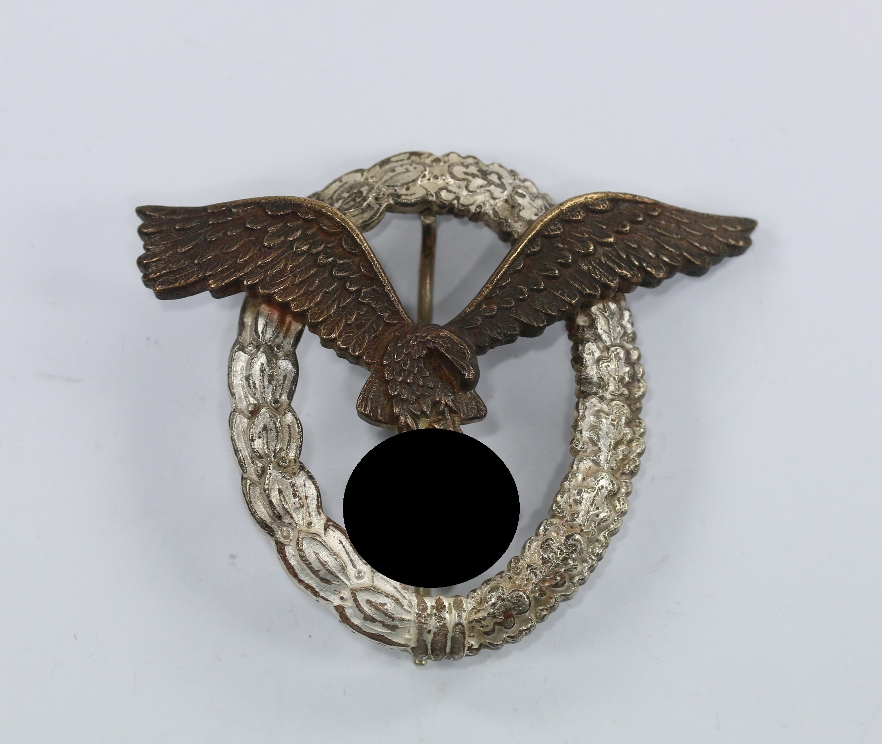 Buntmetall, sehr guter, nur leicht getragener Zustand. Der Kranz mit vollständiger Versilberung, der Adler mit vollständiger Tönung. Mit leichter Patina. Mit Hersteller „B&NL“ für die Firma Berg & Nolte, Lüdenscheid. Der Nadelhaken mit zeitgenössischer Reparatur(!).