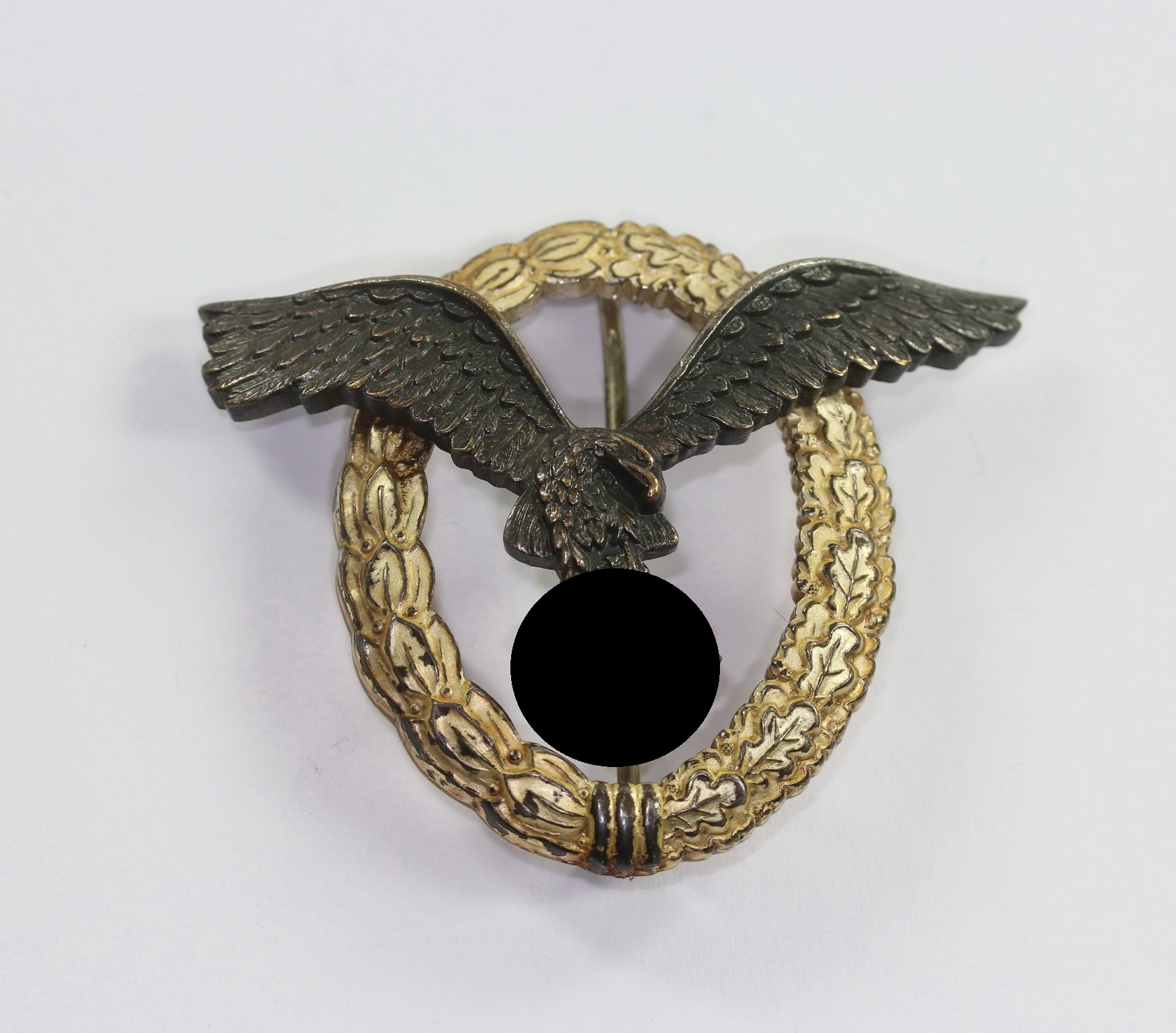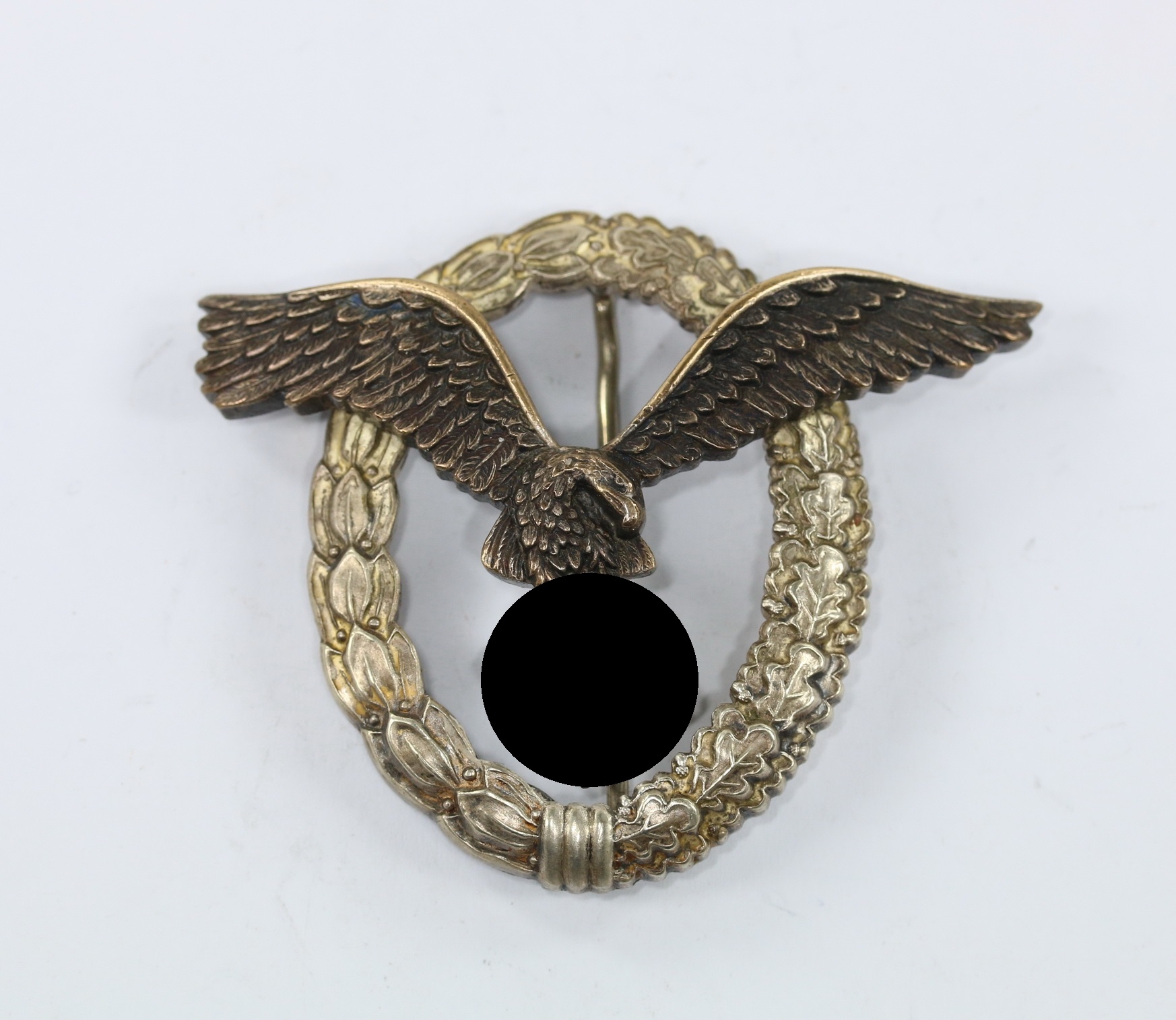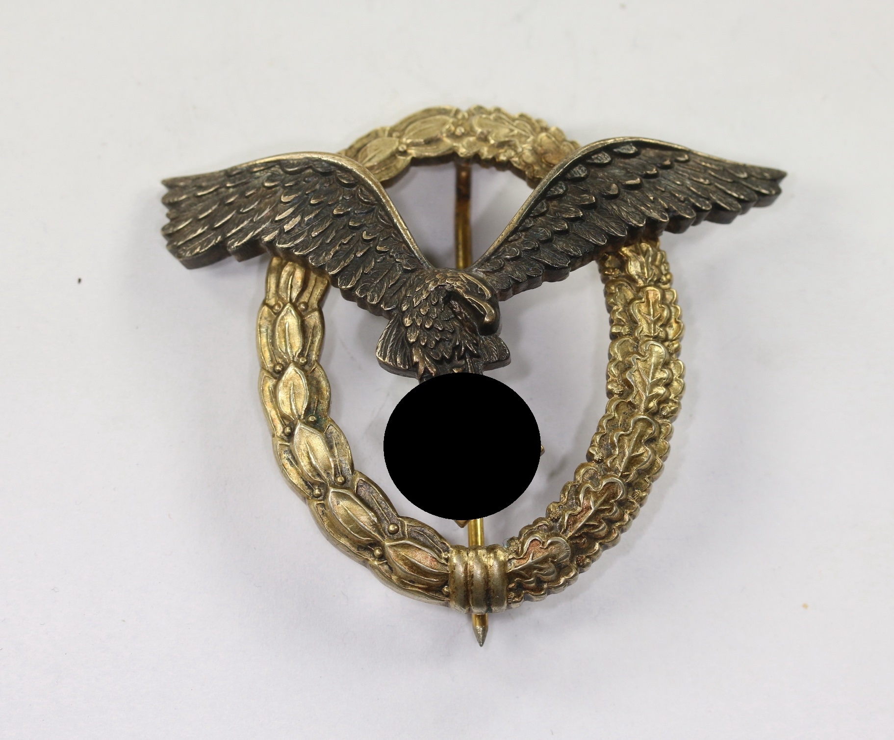Buntmetall, sehr guter, nur leicht getragener Zustand. Der Kranz mit vollständiger Versilberung, der Adler mit vollständiger Tönung. Mit leichter Patina. Mit Hersteller „B&NL“ für die Firma Berg & Nolte, Lüdenscheid. Der Nadelhaken mit zeitgenössischer Reparatur(!).
