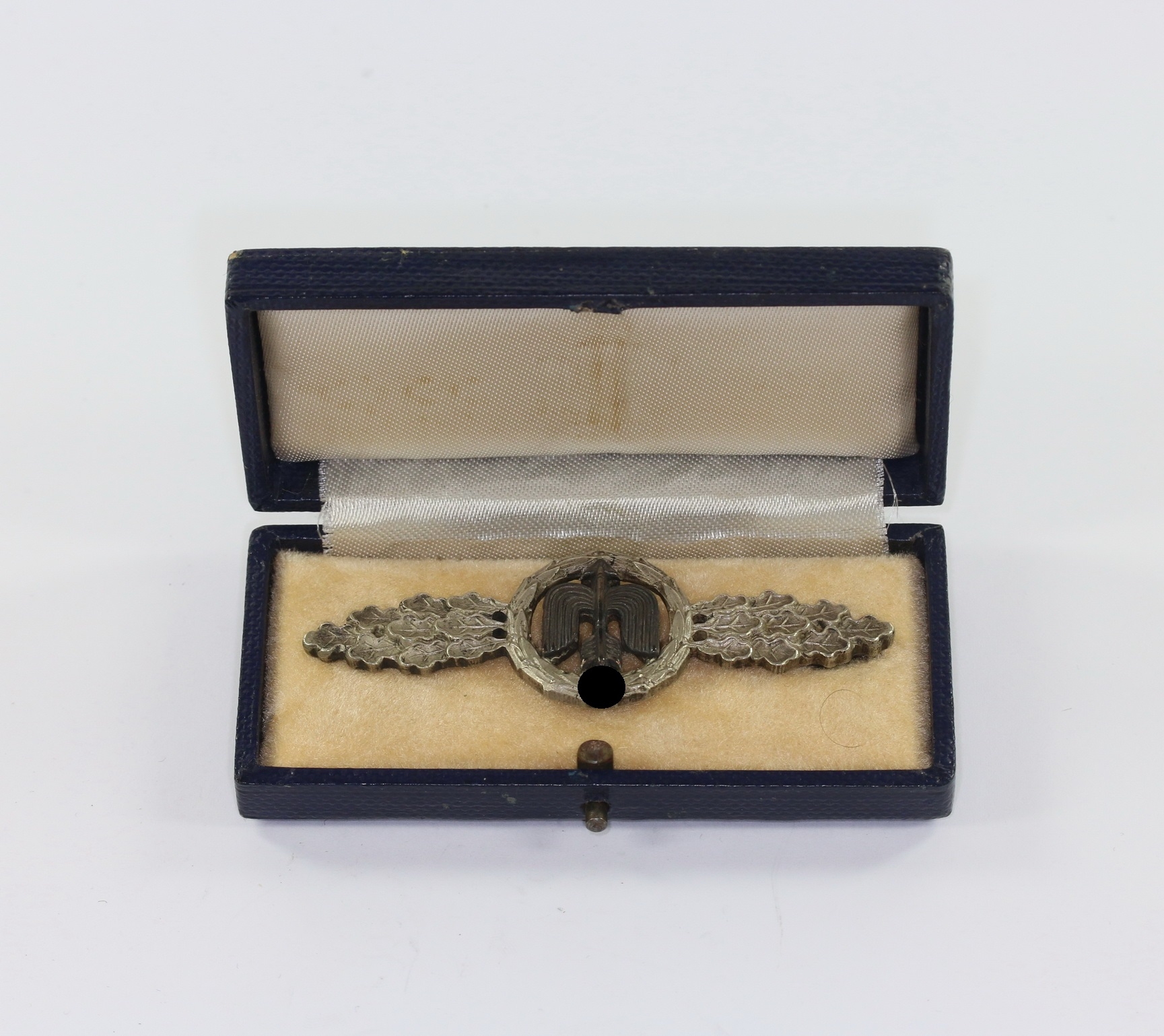 Im zughörigen, frühen Etui. Das Etui in einen sher guten, nur minimal gebrauchten Zustand. Auf den Deckel in Gold eingeprägt „Frontflugspange für Jäger Silber“.