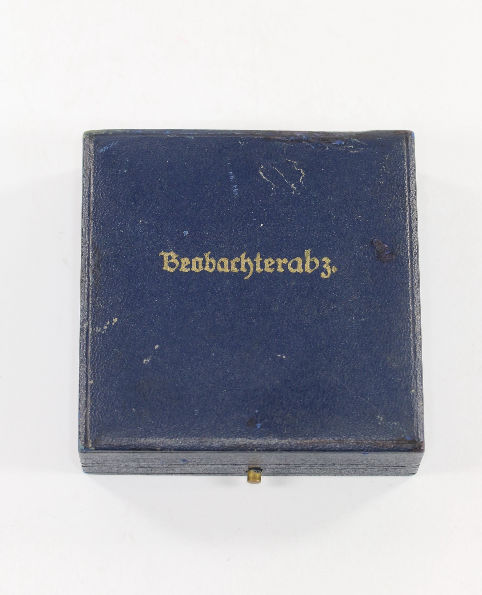 Embossed in gold on top of the lid with the designation „Beobachterabz.“. The inlet covered with blue velvet and the inside of the lid with blue satin.