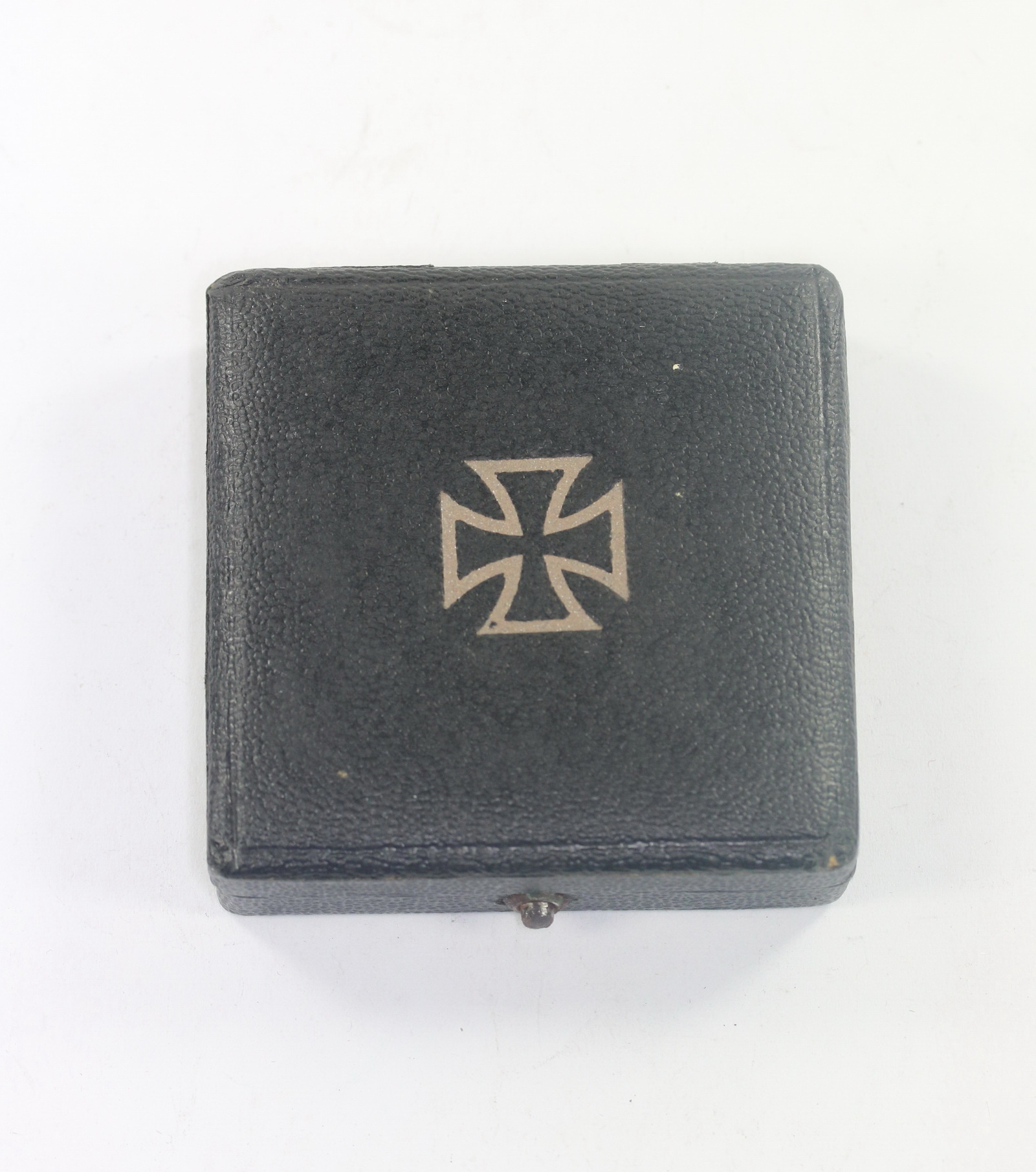 In a very good, slightly used condition. Embossed in silver on top of the flat lid with an image of the cross. The inlet covered with beige velvet and the inside of the lid with white satin.