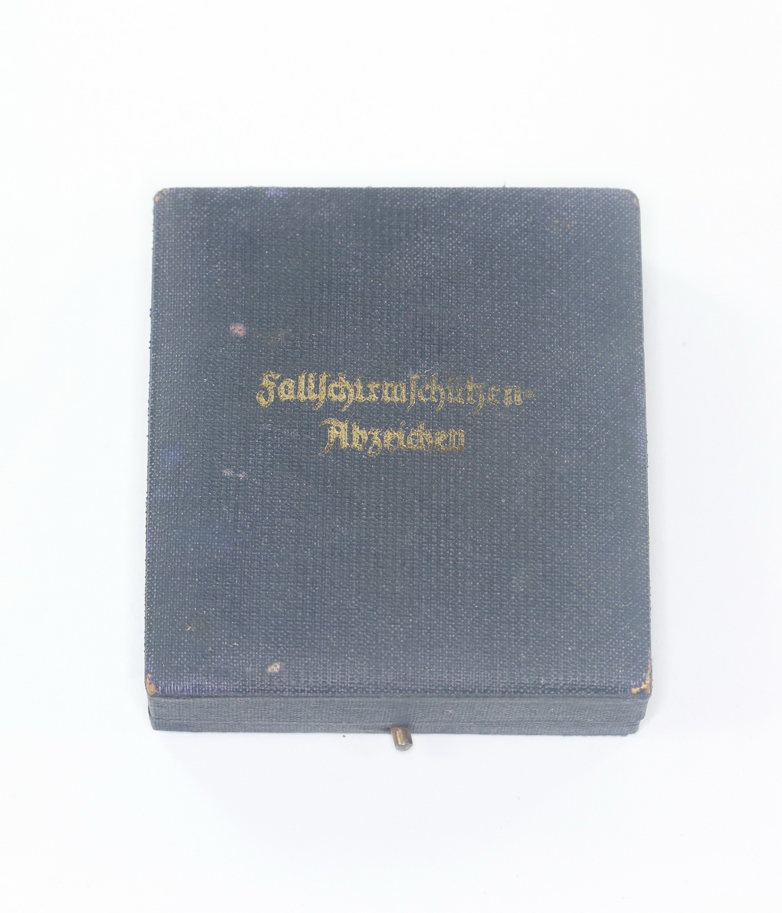 Sehr guter, leicht gebrauchter Zustand. Auf den Deckel in Gold eingeprägt „Fallschirmschützen Abzeichen“. Mit der für ganz frühe Etuis typischer Bespannung. Typisches Etui für frühe Stücke von Juncker, Assmann, oder Deumer.