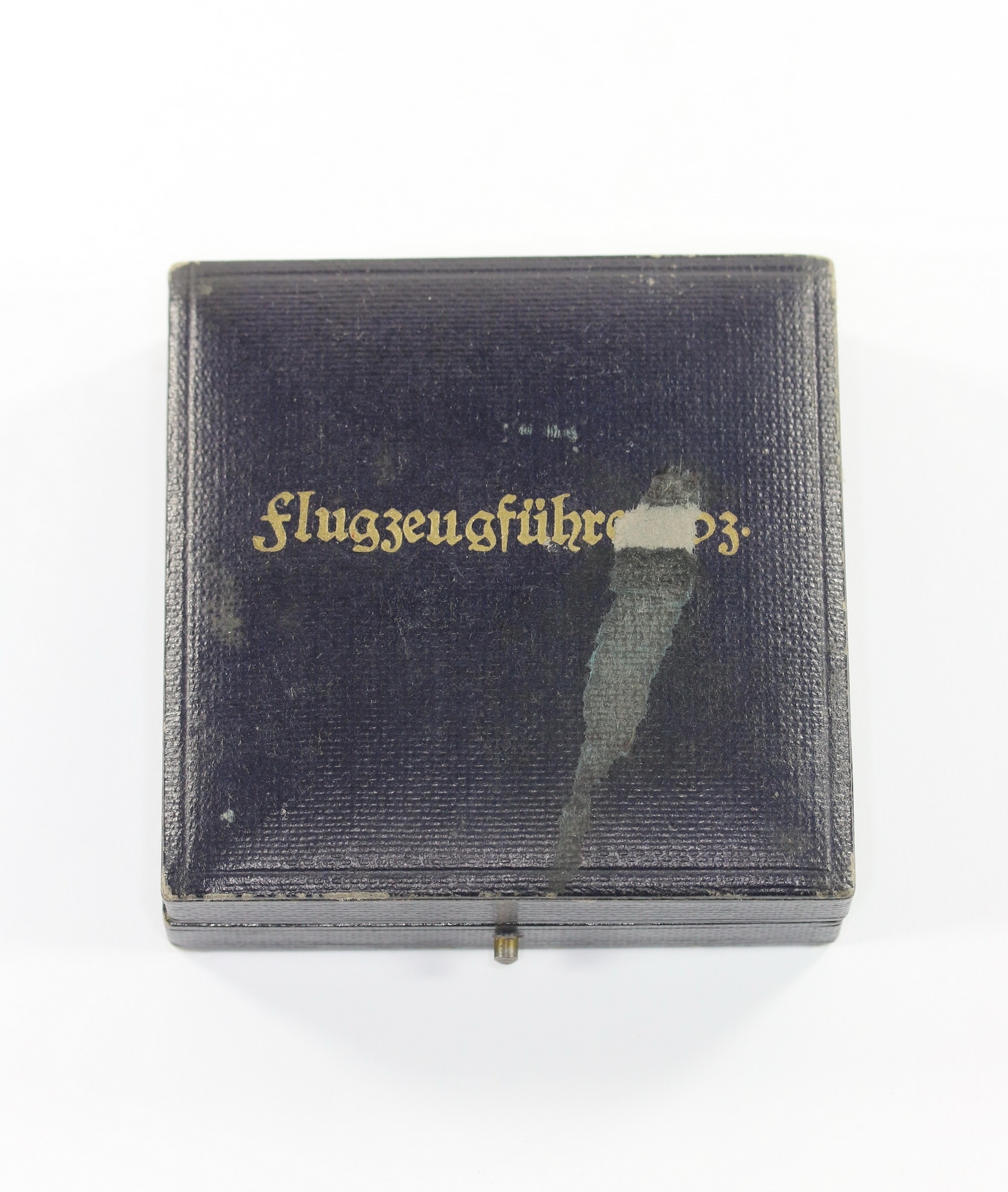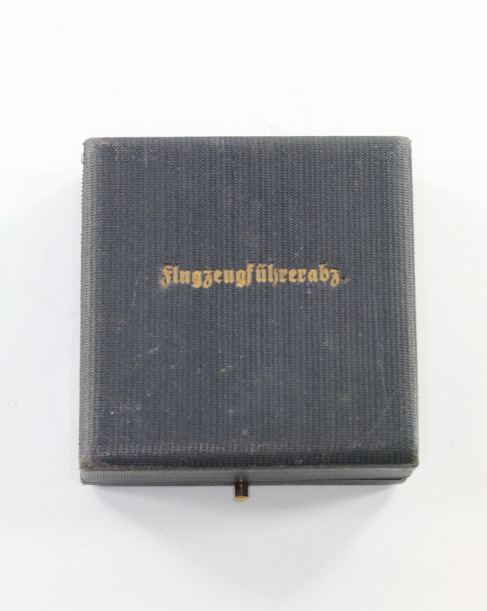 The early pattern case with cloth like covering and in a very good, slightly used condition. Embossed in gold on top of the lid with the designation „Flugzeugführerabz.“. The inlet covered with blue velvet and the inside of the lid with blue satin.