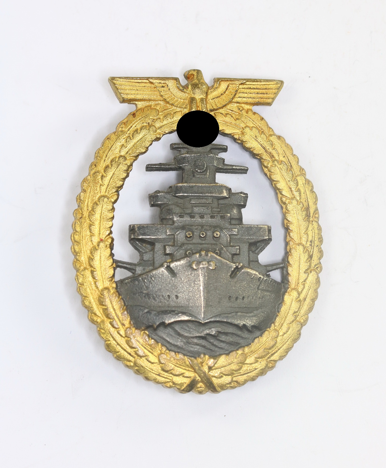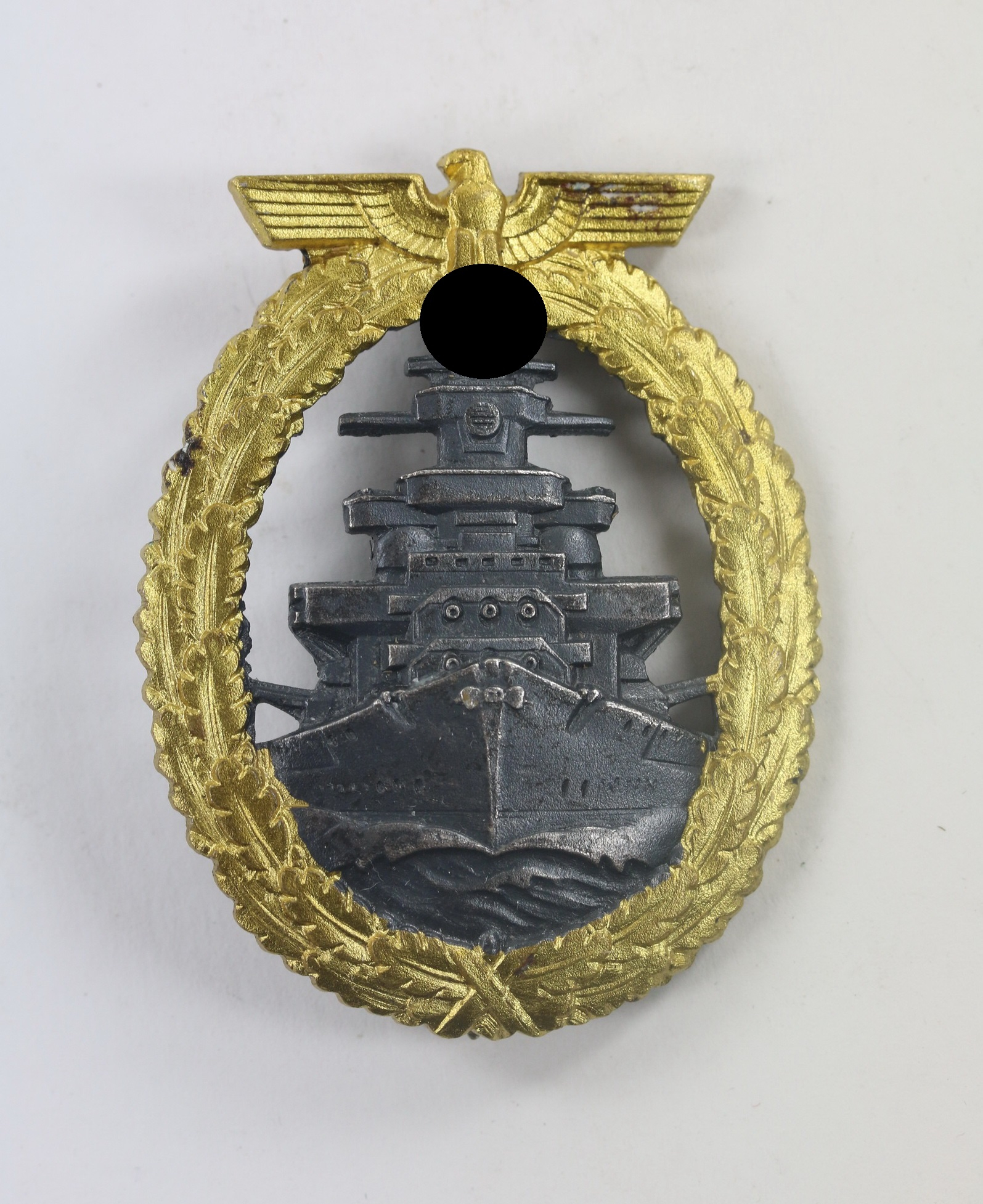 Marked on the reverse with the maker „Schwerin Berlin“. See Weber/Skora, The War Badges of the Kriegsmarine. Early pattern Badge with all five bridge windows and deep indentation of the ships bow on the reverse.