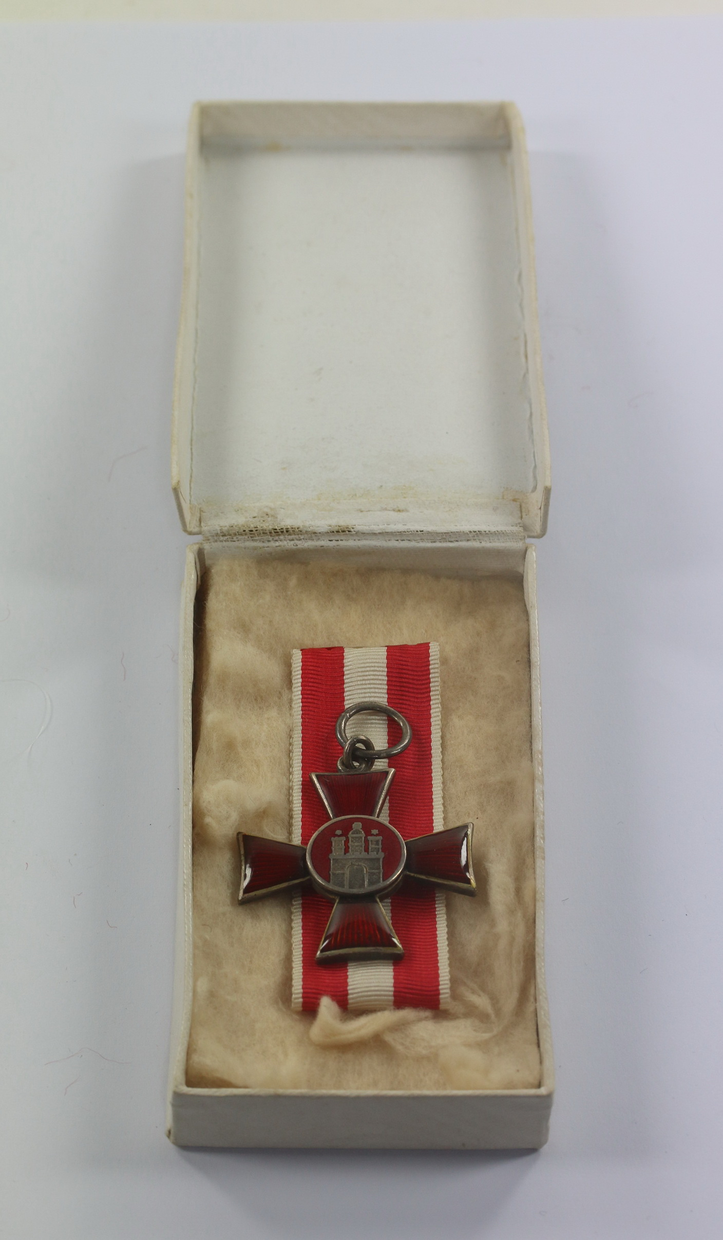 Buntmetall, emailliert, sehr guter, ungetragener Zustand. Die Emaille ohne Fehler. Im zugehörigen Etui. Das Etui in einen sehr guten, nur leicht gberauchten Zustand. Auf den Deckel das Stadtwappen der Hansestadt Hamburg.