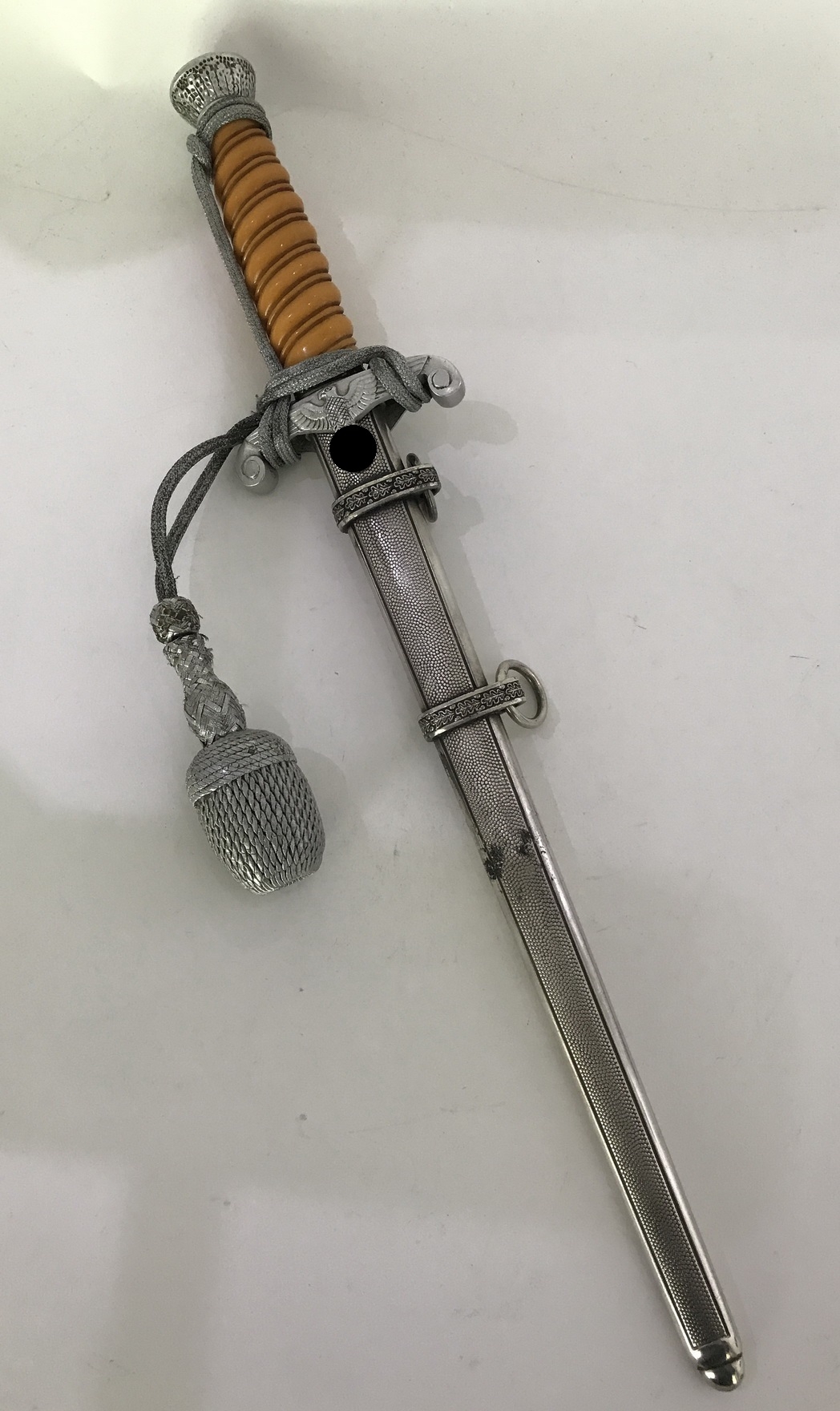 In a very good, slightly used condition. The yellow grip without chips or breaks. The crossguard and pommel both made of aluminium(!) And undamaged. The iron scabbard with some signs of use but no dents. The blade clean and marked near the crossguard with the maker „E. Pack & Söhne Solingen“. With originally bound dagger knot.