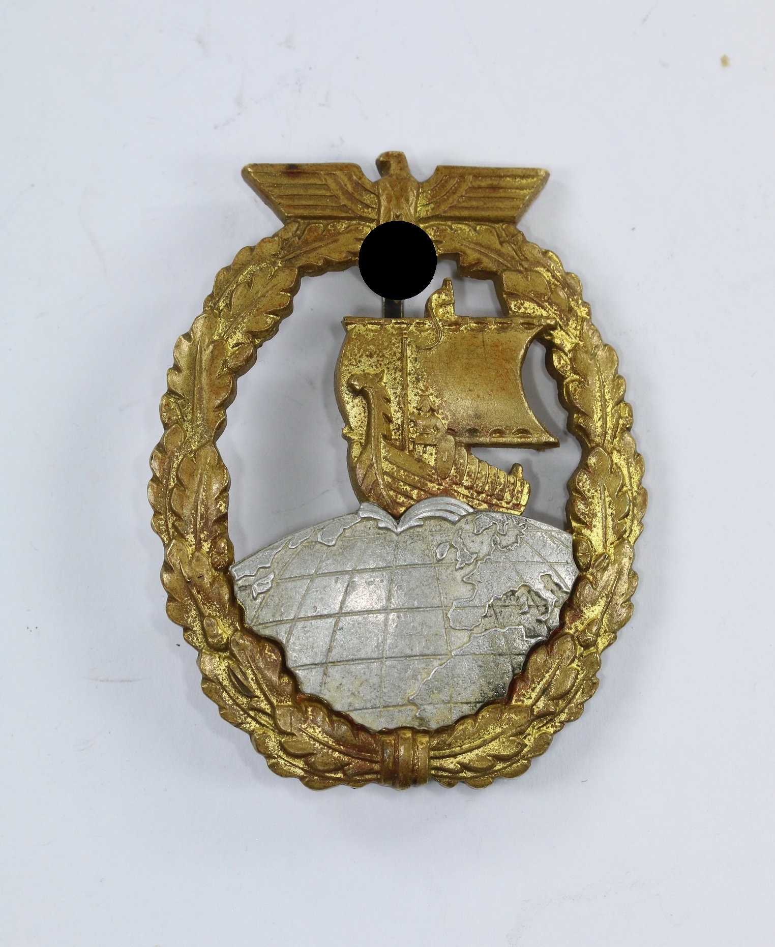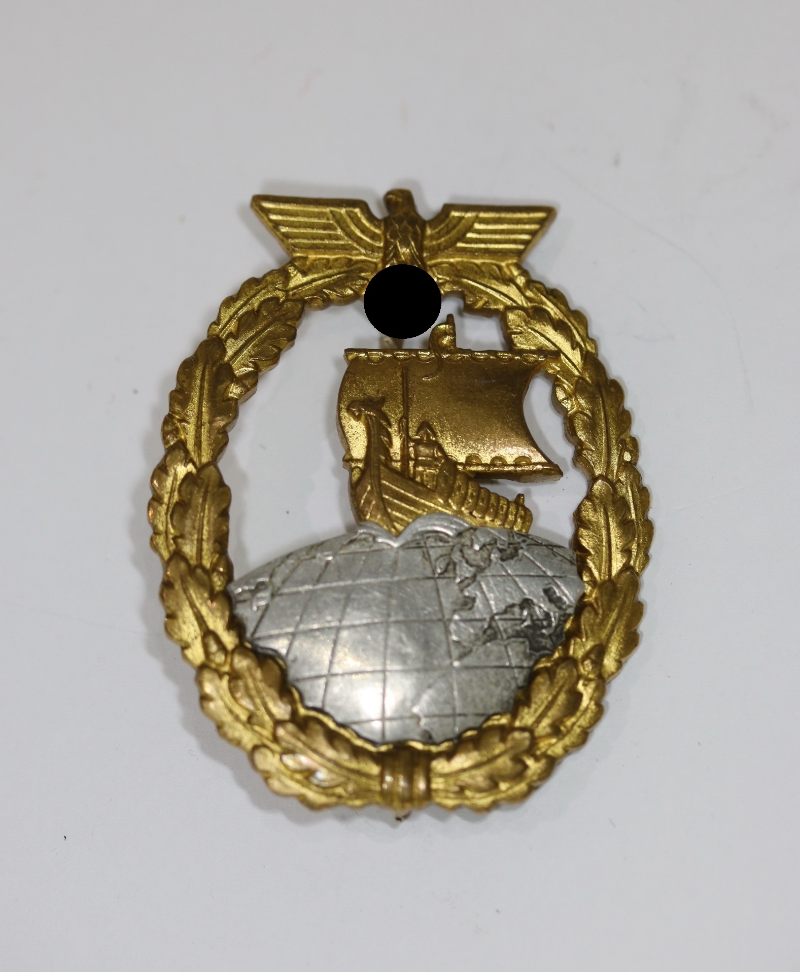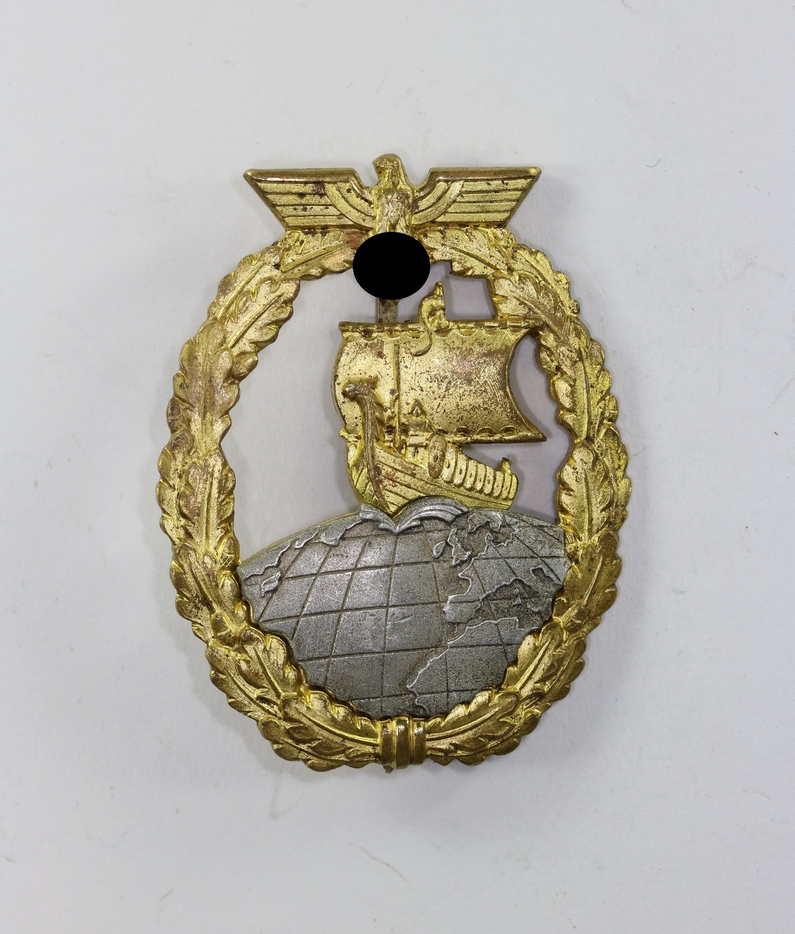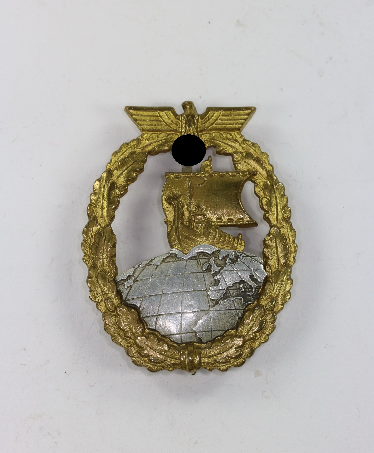 Buntmetall, sehr guter, ungetragener Zustand. Mit fast vollständiger, strahlender Vergoldung. Der Globus separat aufgenietet. Mit Hersteller „Schwerin Berlin“. Siehe Weber/Skora, Die Kriegsabzeichen der Kriegsmarine.