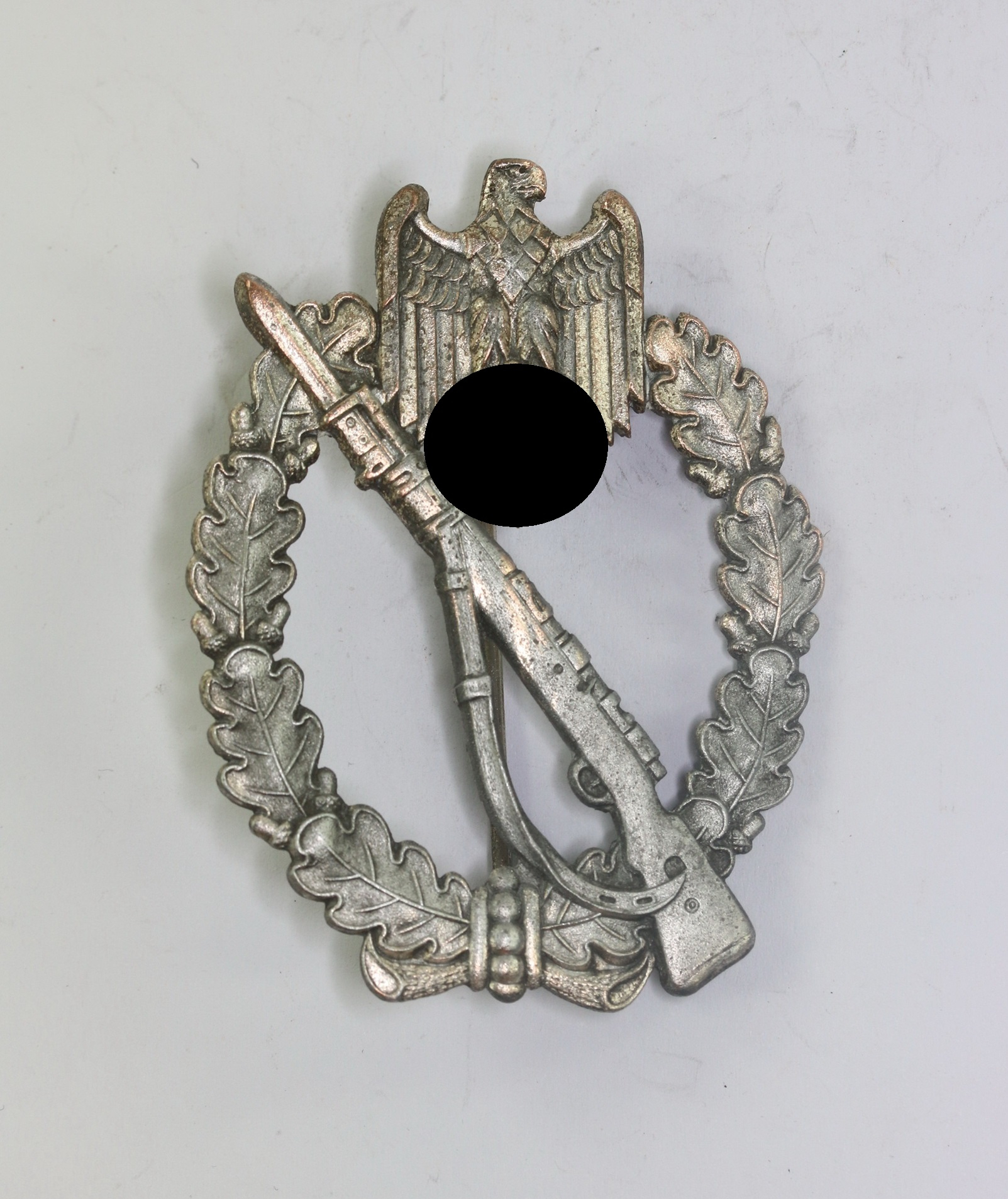 Zink, sehr guter, nahezu ungetragener Zustand. Mit vollständiger Versilberung, mit leichten Ansätzen von Patina. Ohne Hersteller, aber eine bekannte Variante der Firma Deschler & Sohn, München (L/10), siehe GCA-Datenbank.