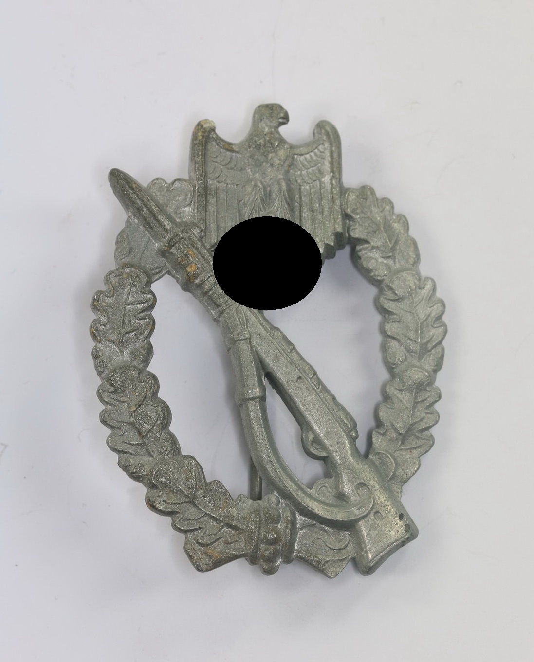 Zink, sehr guter, leicht getragener Zustand. Mit noch schöner Versilberung. Rückseitig im Gewehrkolben die Hersteller Markierung „ÜÜ“ für die Firma Ferdinad Wiedmann aus Frankfurt am Main. Siehe auch GCA-Datenbank.