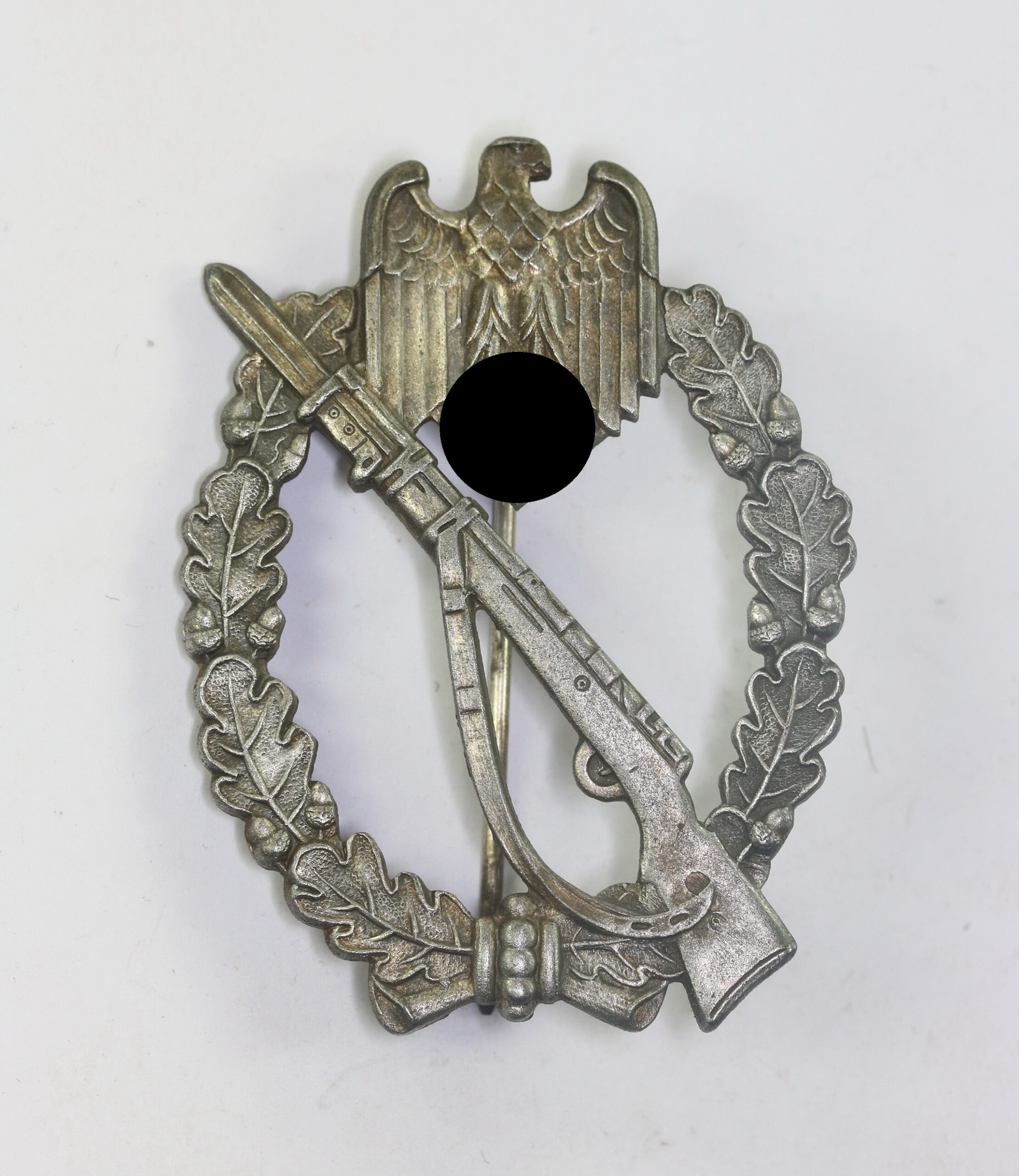 Zink, sehr guter, leicht getragener Zustand. Mit vollständiger Versilberung und leichter Patina. Ohne Hersteller, aber eine bekannte Variante der Firma Paul, Meybauer, Berlin. Siehe GCA-Datenbank.
