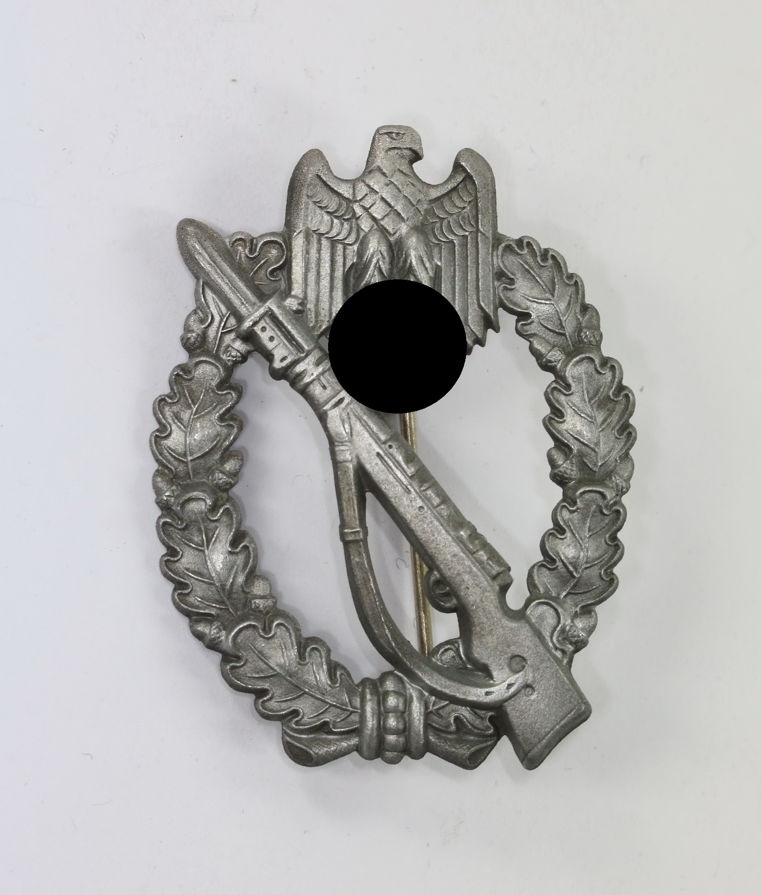 Zink, sehr guter, minimal getragener Zustand. Mit fast vollständiger Versilberung. Ohne Hersteller, aber eine bekannte Variante der Firma Sohni, Heubach & Co., Oberstein (S.H.u.Co.).. Siehe auch GCA-Datenbank.