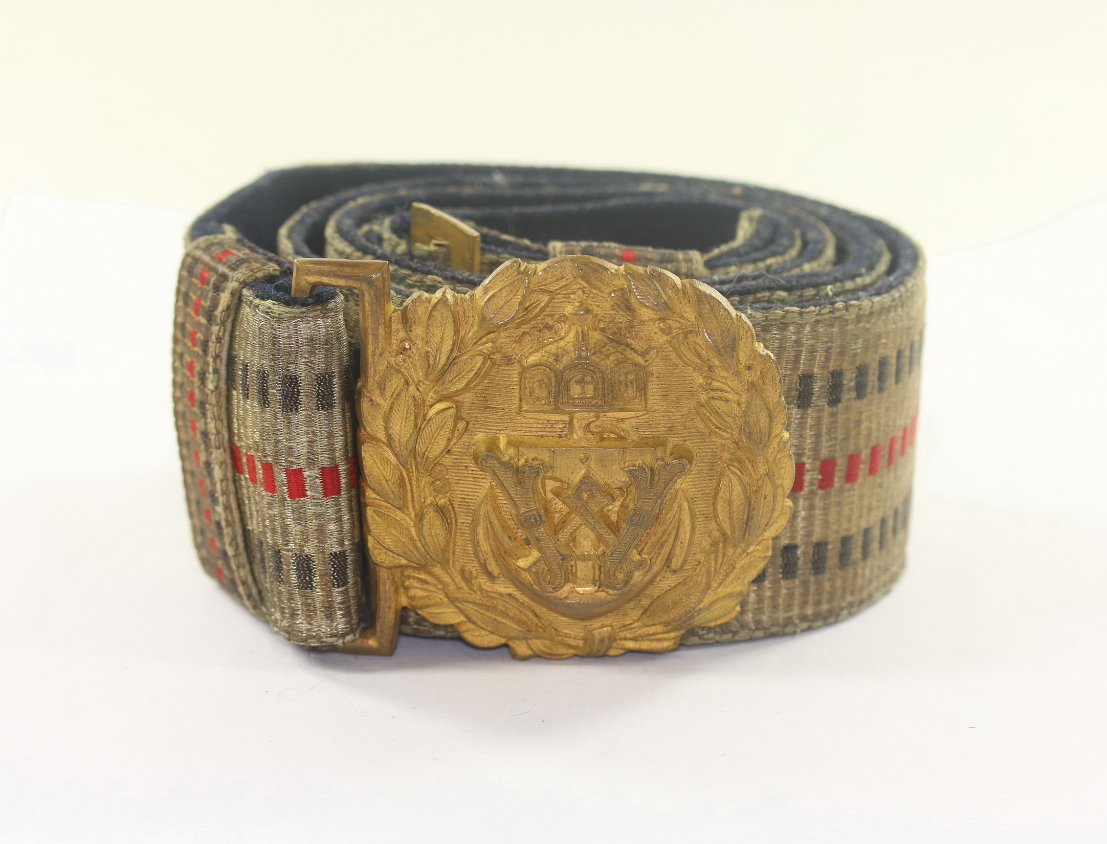 Sehr guter, leicht getragener Zustand. Mit Patina und leichten Lagerspuren. Silbergespinstbinde mit 2 grauen und 1 roten Durchzug. Massives Schloss aus vergoldeten Buntmetall. Das Schloss in 60mm Ausführung Chiffre W. mit Anker und Kaiserkrone. Dunkelblaue Tuchunterlage.