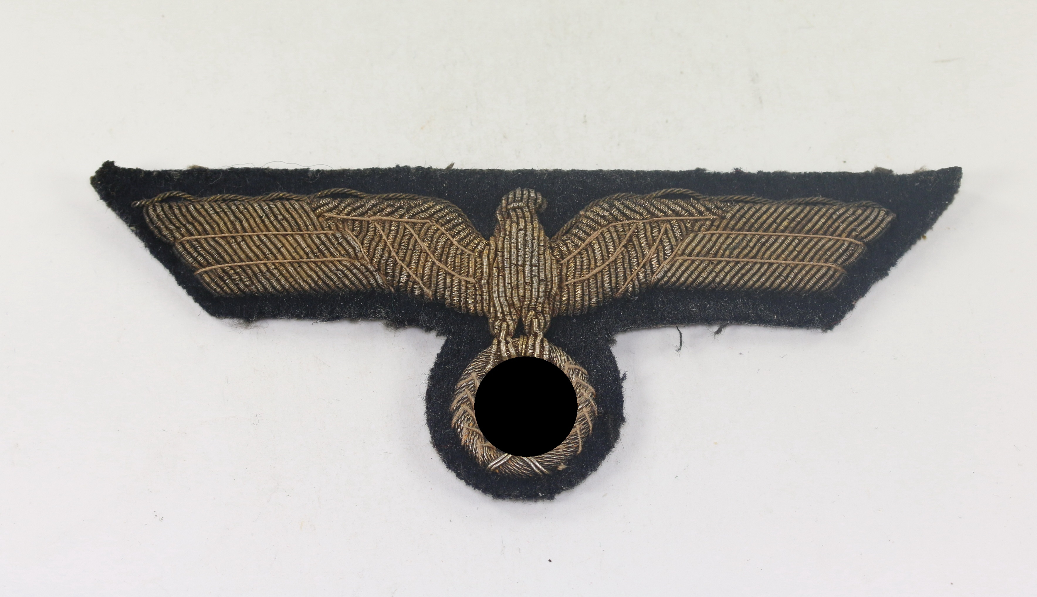 Gold embroidered metal threads on dark blue and in a very good, slightly worn condition. The reverse with most of the original covering paper.