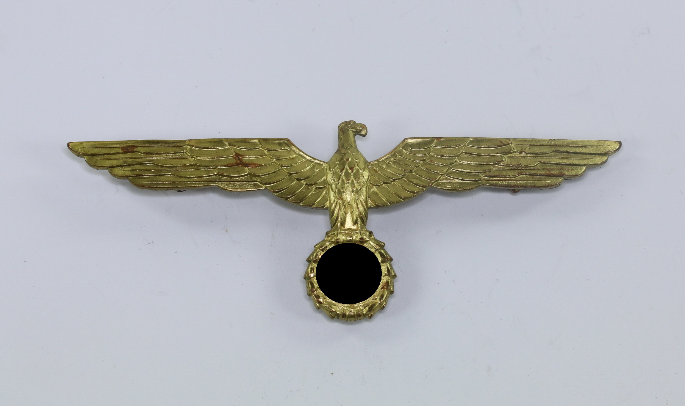 Buntmetall, vergoldet, sehr guter, leicht getragener Zustand. Mit vollständiger, strahlender Vergoldung, Hakenkreuz und Kanten poliert. Ohne Hersteller, aber eine bekannte Variante.