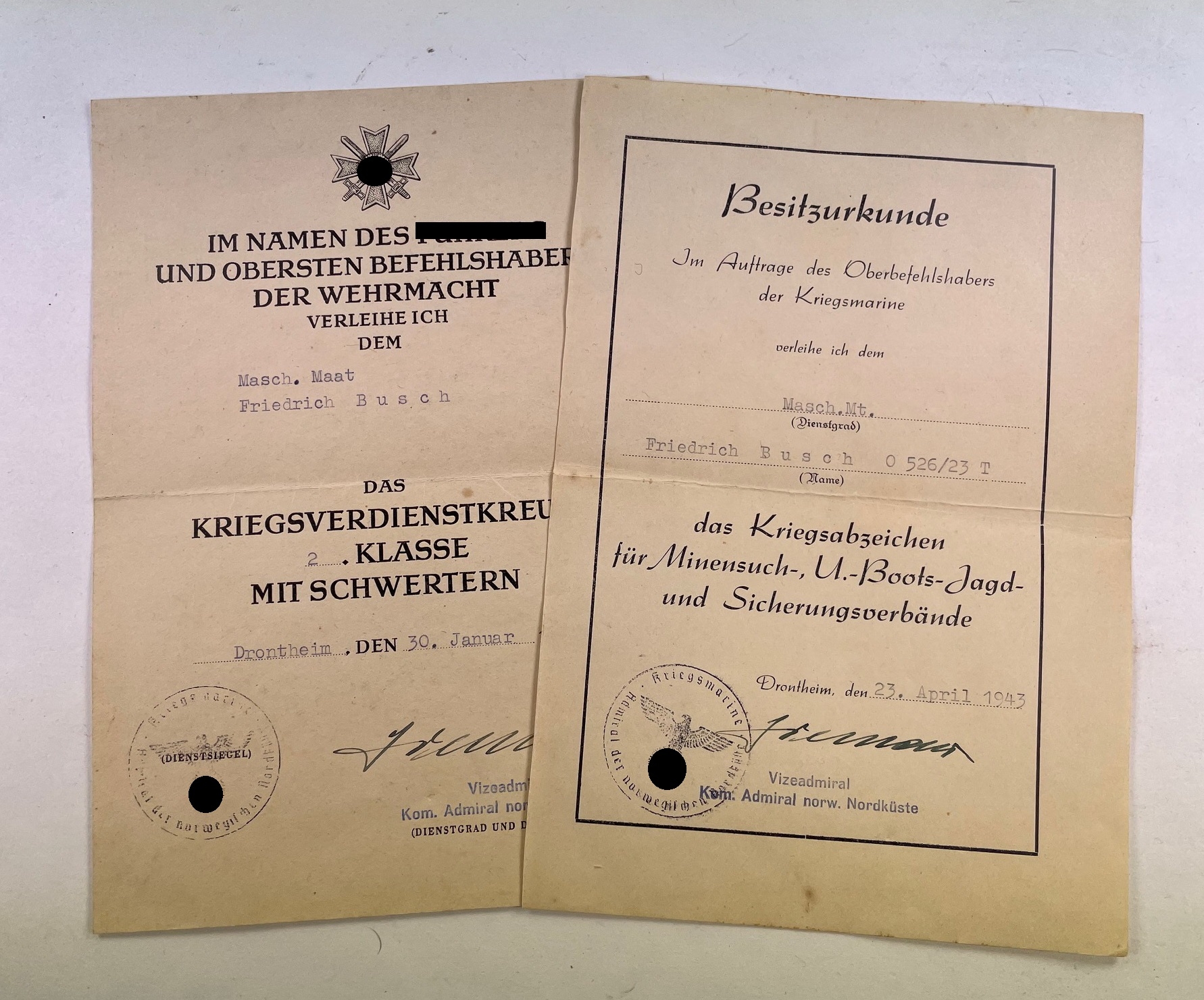 – Besitzurkunde Kriegsabzeichen für Minensuch-, U-Boots-Jagd- und Sicherungsverbände
