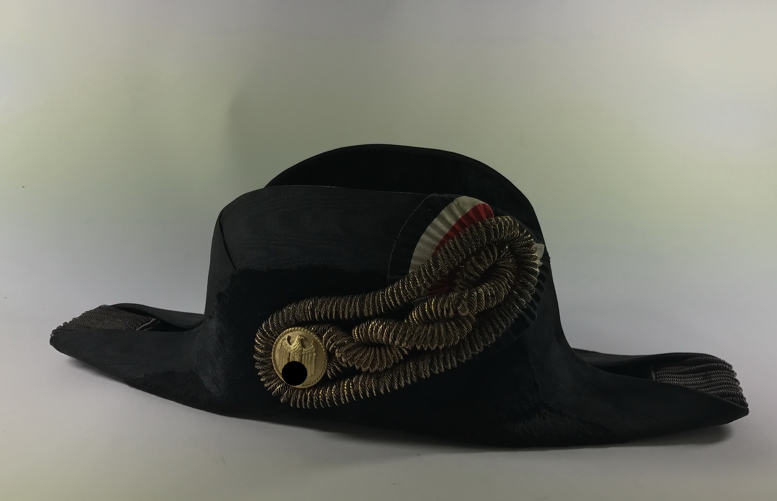 In a very good, very slightly worn condition. Black felt with black ribbed ribbon, on the side a silk folder black/red/gold cockade with gold button and large gold plated eagle.
