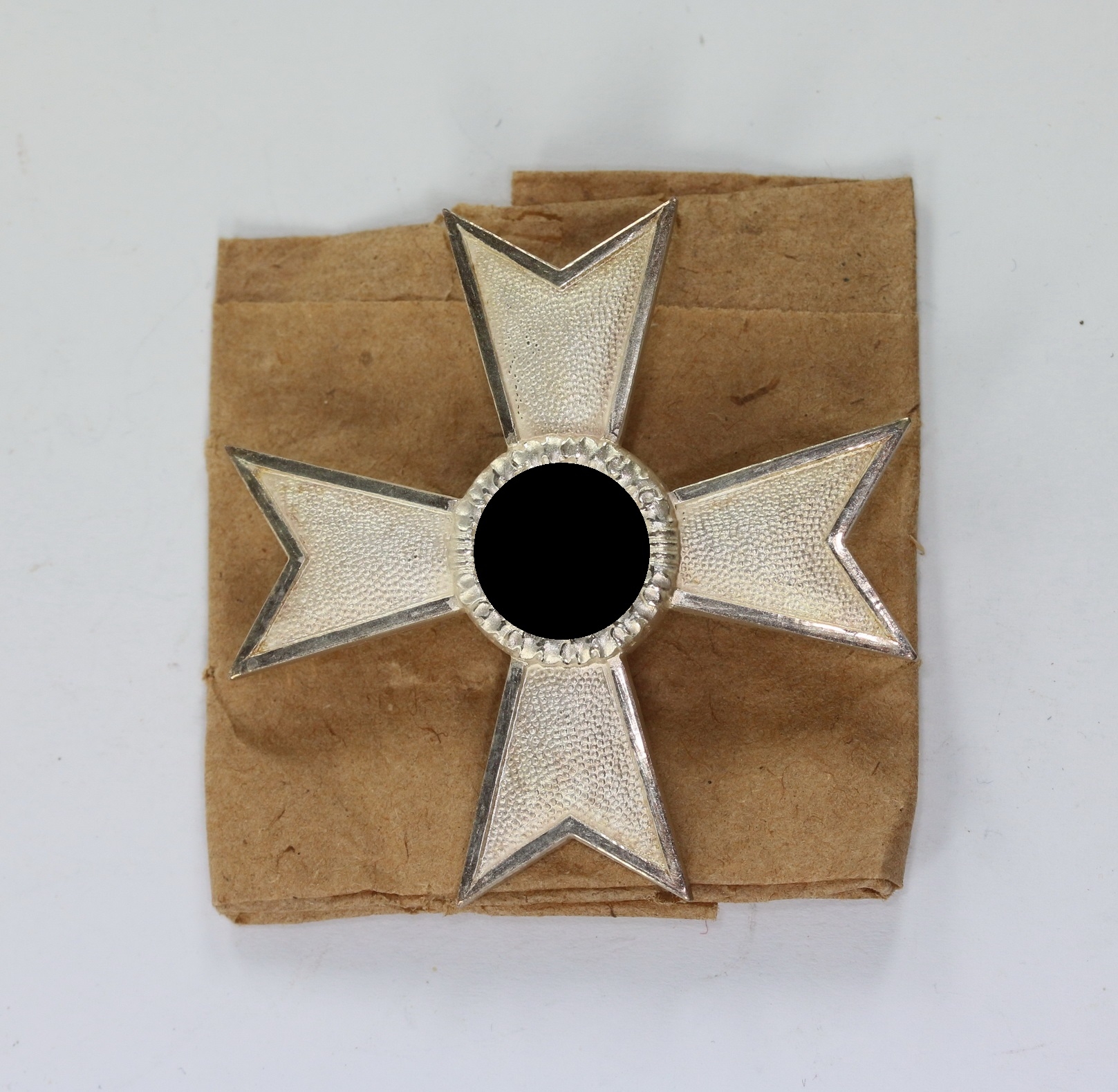 Tombak/brass based and in an excellent, unworn condition with all of the matt silver plate still present. The swastika and high points burnished and all with some patina. Still in the original tissue paper wrapping.