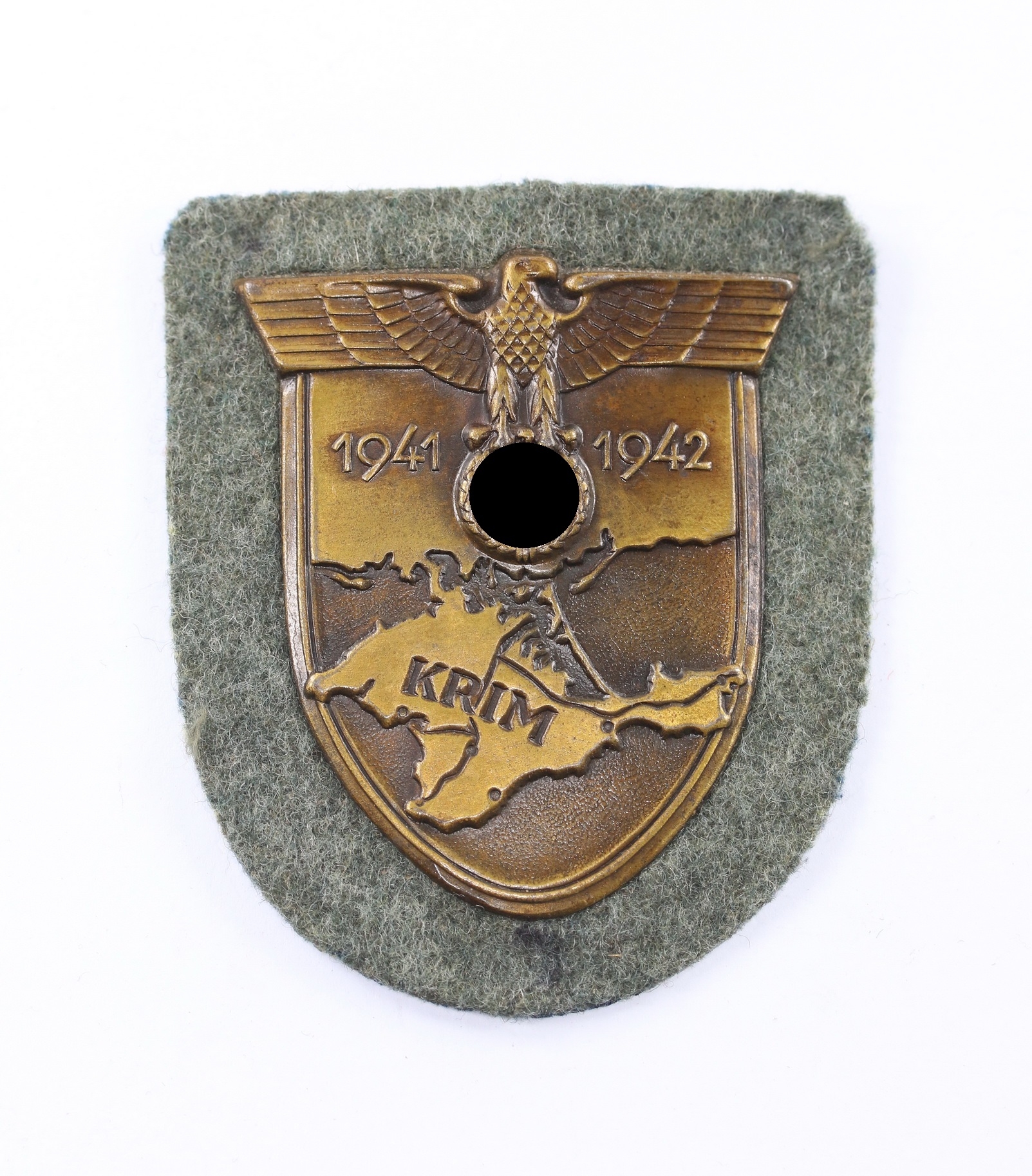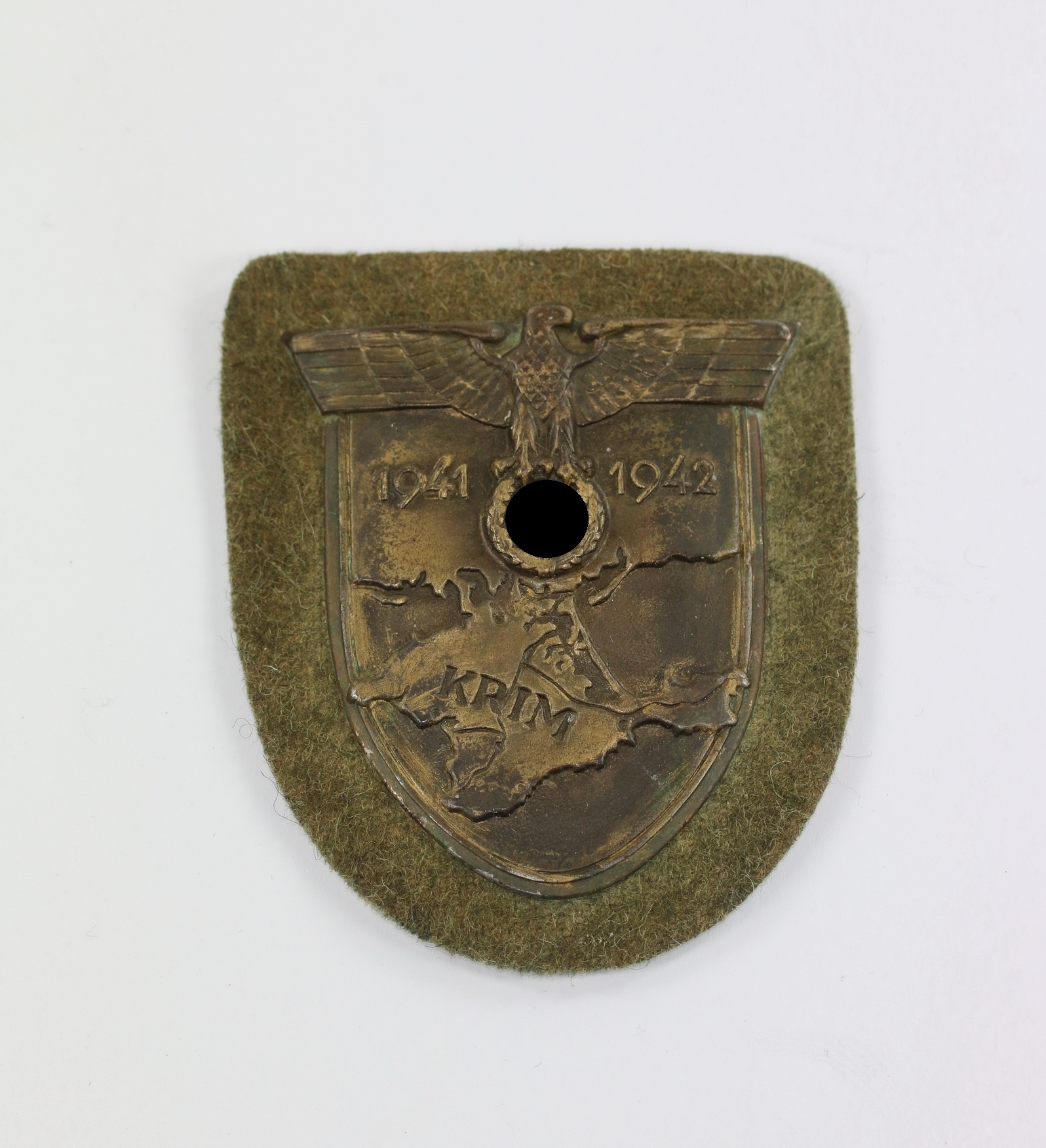 Eisen, sehr guter, ungetragener Zustand. Mit fast vollständiger Bronzierung. Ohne Hersteller, aber eine bekannte Variante. Siehe GCA-Datenbank, Typ 3.10. Vollständig mit allen vier Splinten, der Gegenplatte und der typischen hellen Papier Abdeckung.