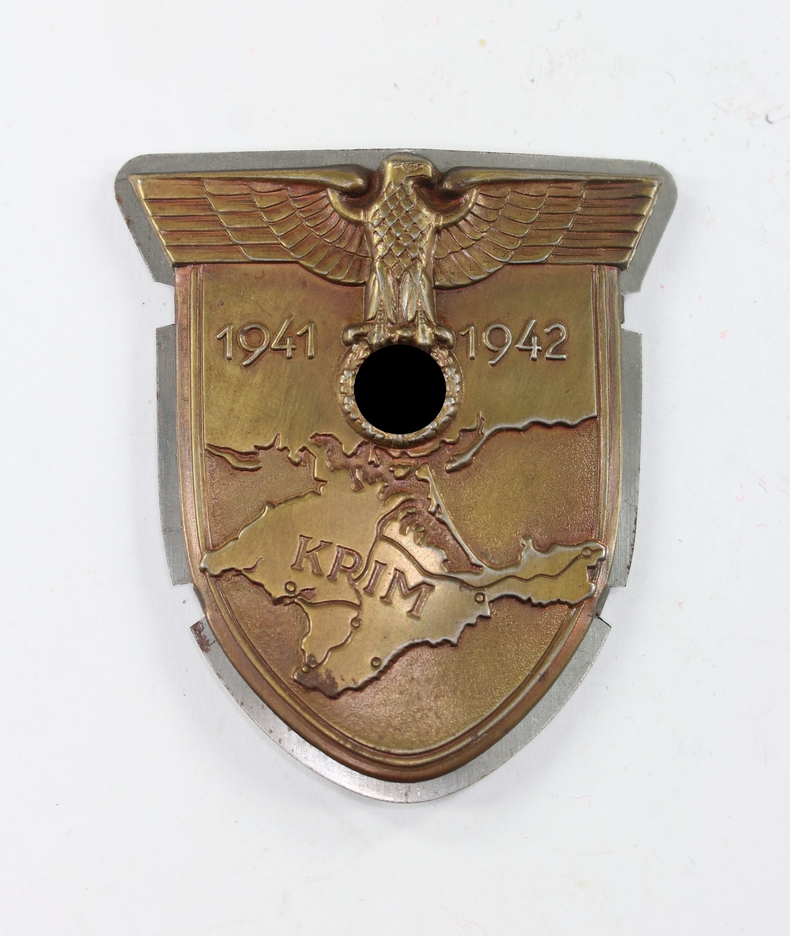 Iron based and in a very good, probably unworn condition with all of the bronze wash still present. Complete with all four side prongs and backing plate.