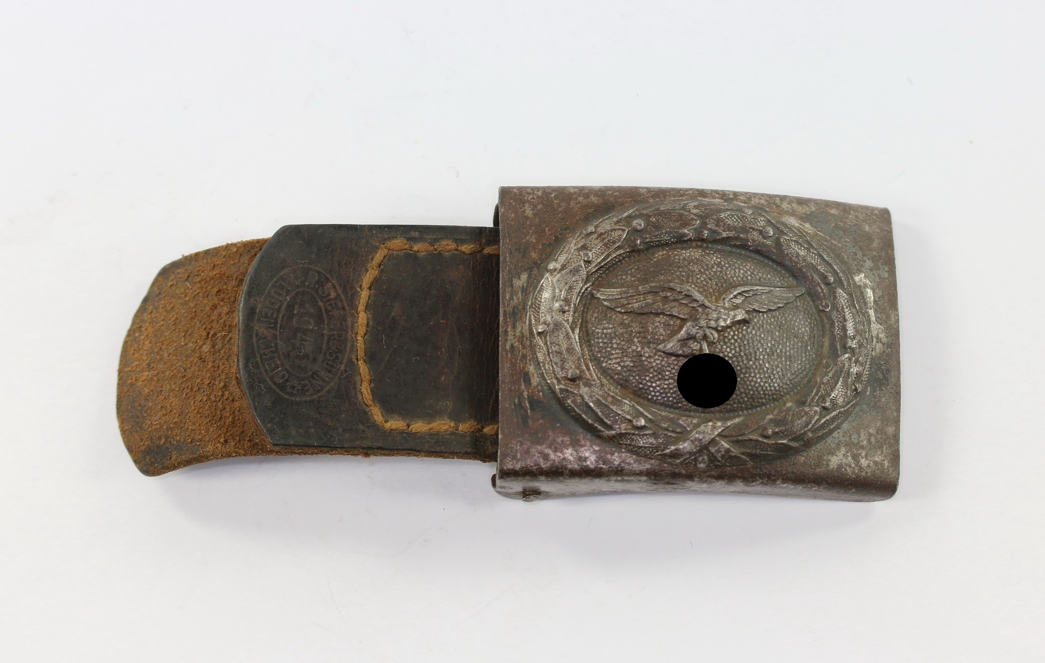 Eisen durchgeprägt, sehr guter, getragener Zustand. Mit Resten der blauen Farbe und leichten Flugrost. Unberührter Fundzustand. Mit Leder Lasche, diese mit Hersteller „Sieper & Söhne Lüdenscheid 1940“.