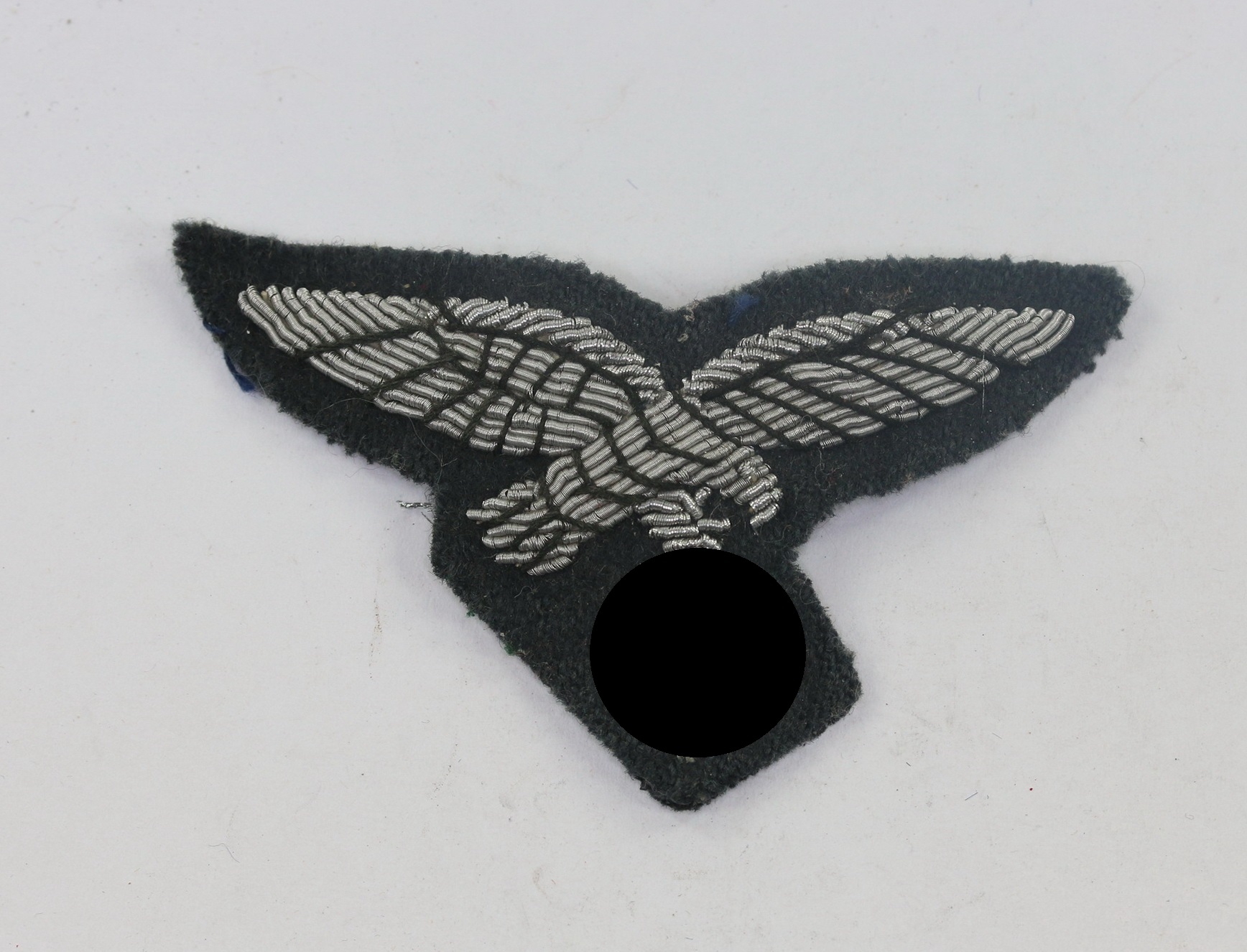 Hand embroided metal threads on dark blue background and in a very good, slightly worn condition. 1st pattern Luftwaffe eagle.