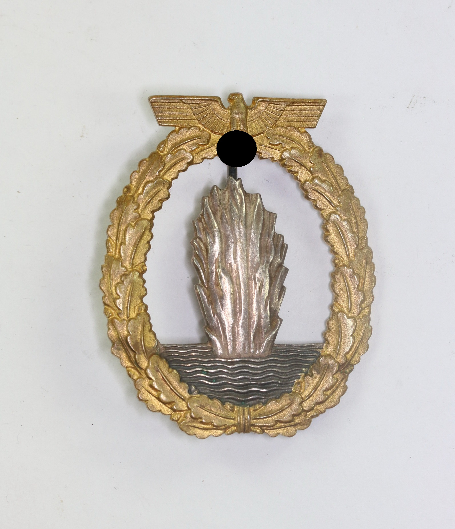 Tombak/brass based and in a very good, slightly worn condition. The wreath with practically all of the gilt plate still present. The explosion with all of the silver plate and the waves dark oxidised.