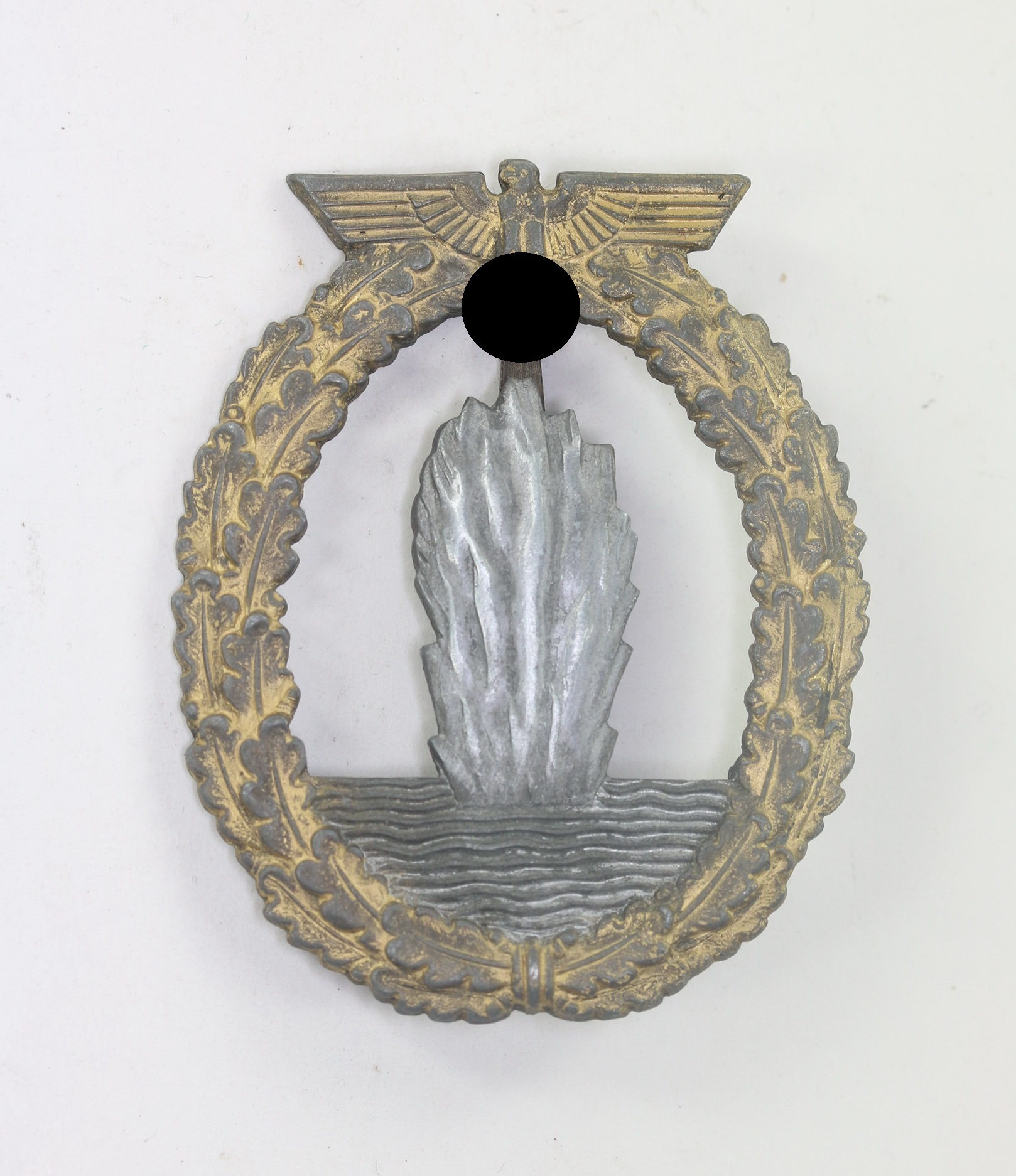 Tombak/brass based and in an excellent, probably unworn condition. The wreath with all of the matt gilt plate still present. The explosion with all of the silver plate and the waves dark oxidised.