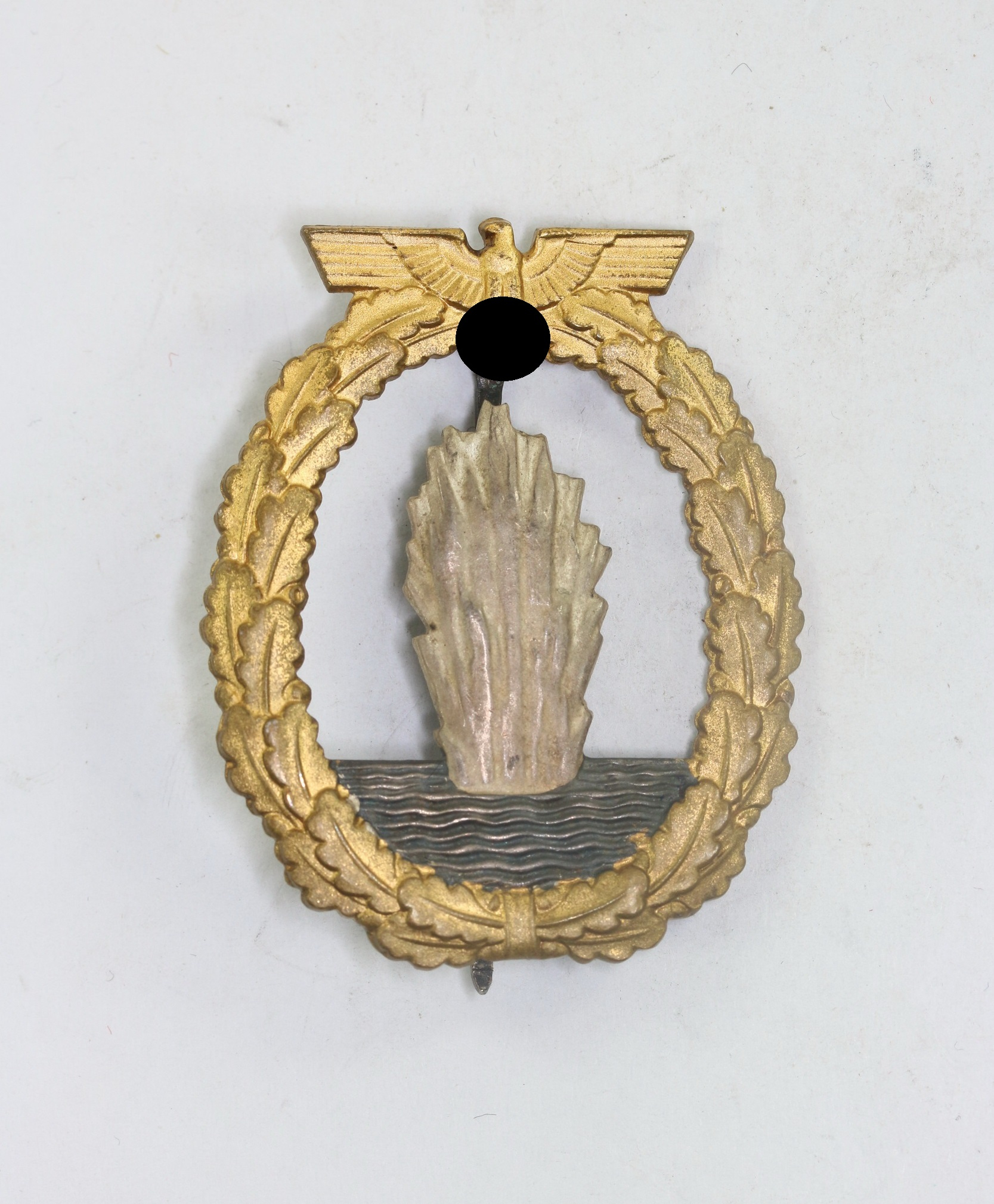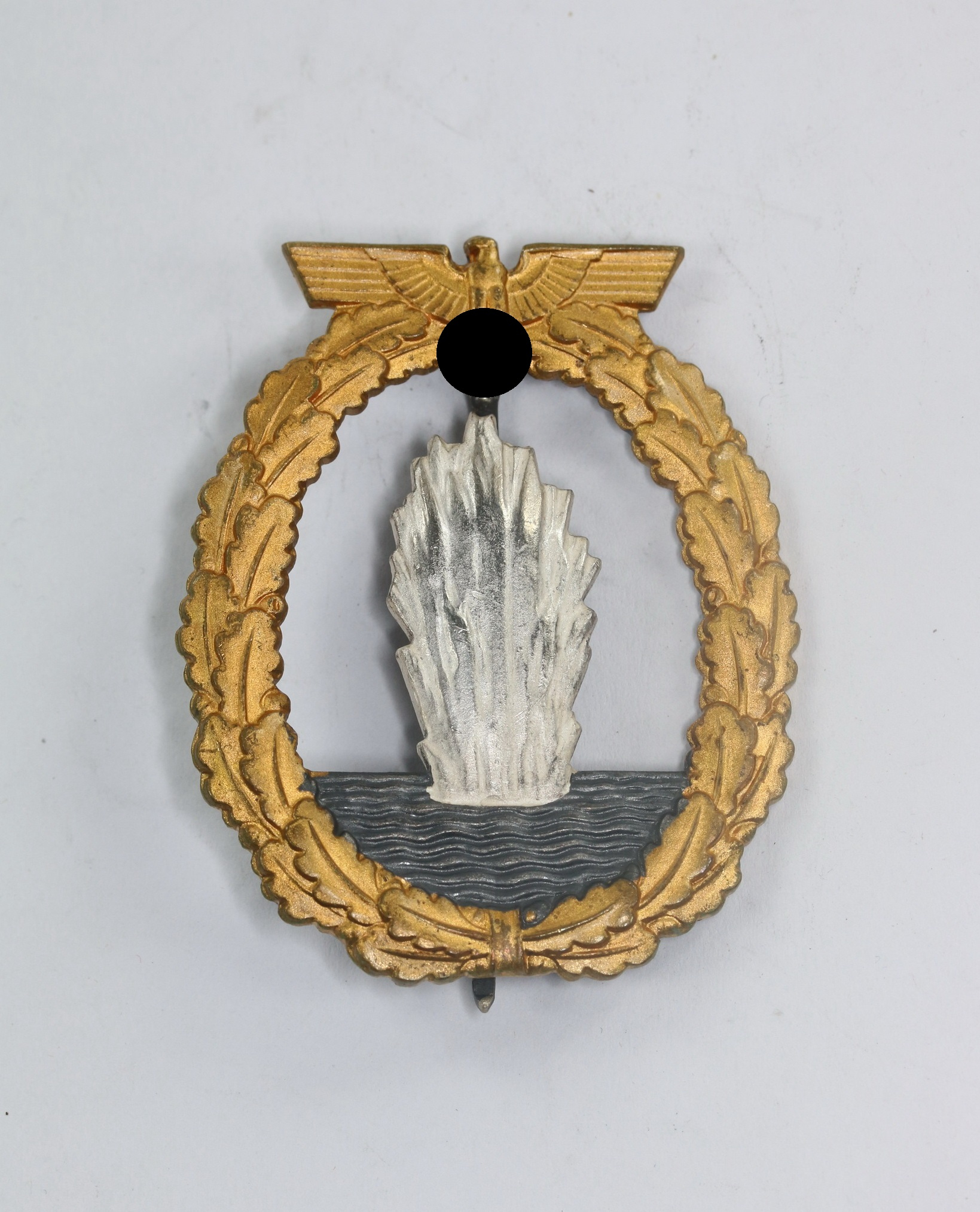 Buntmetall, sehr guter, nur minimal getragener Zustand. Der Kranz mit fast vollständiger Vergoldung, die Fontäne mit vollständiger, frostiger Versilberung. Das Wasser mit vollständiger, dunkler Tönung. Mit Hersteller „Schwerin Berlin“ und „FEC. Otto Plazek Berlin“. Siehe GCA-Datenbank.