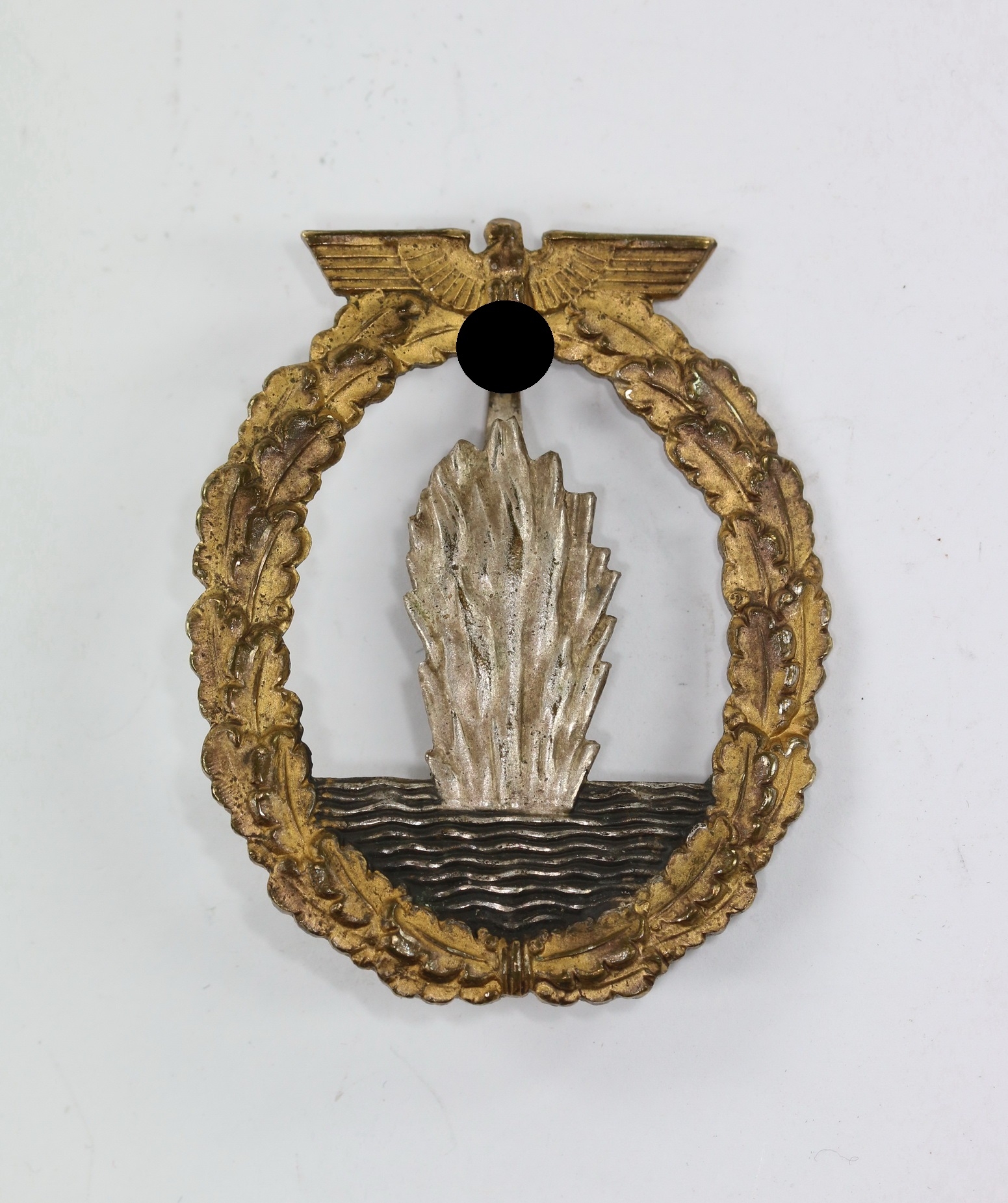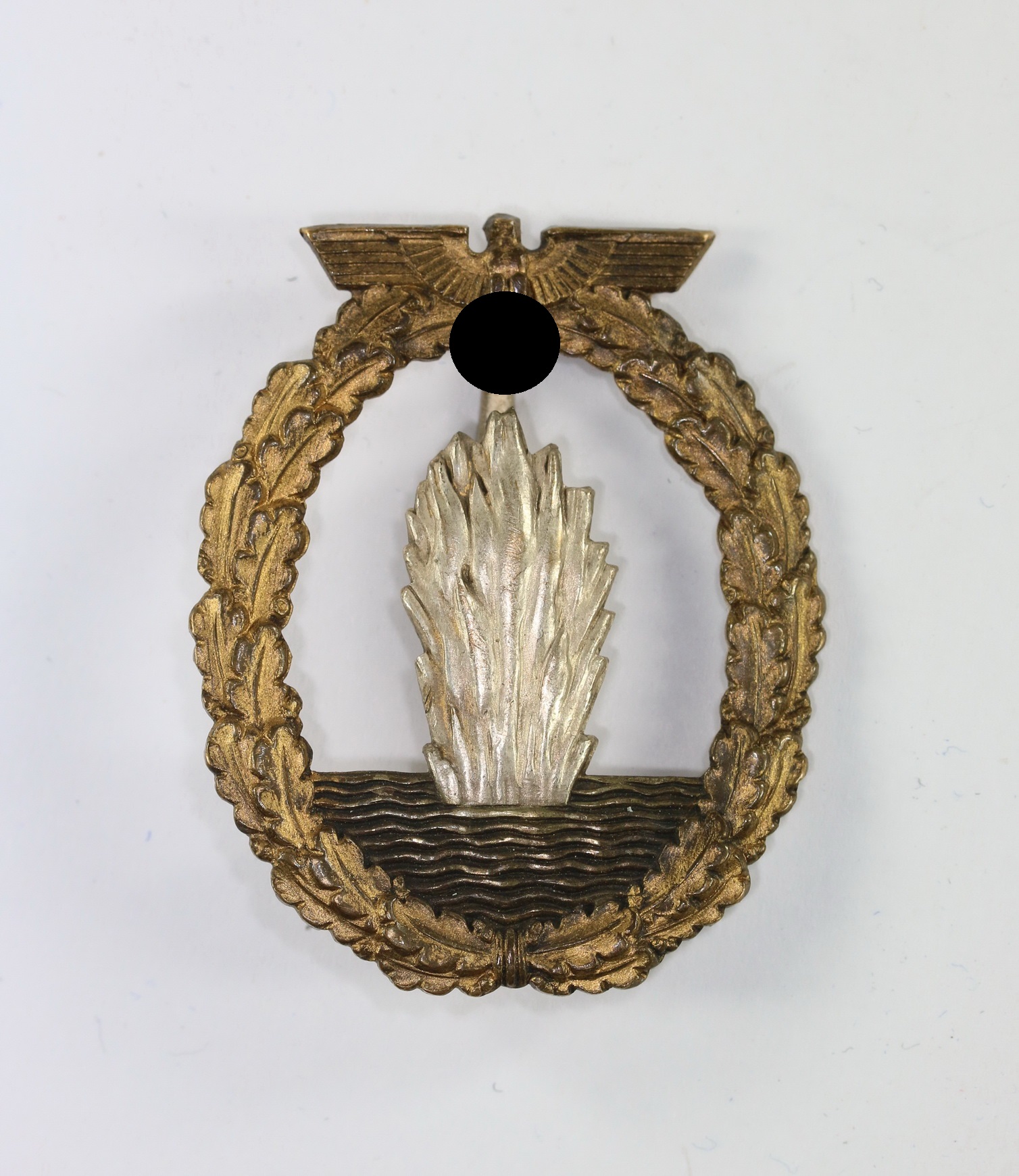 Tombak/brass based and in a very good,slightly worn condition. The wreath with most of the gilt plate. The explosion with all of the silver plate still present and some patina, the waves dark oxidised.
