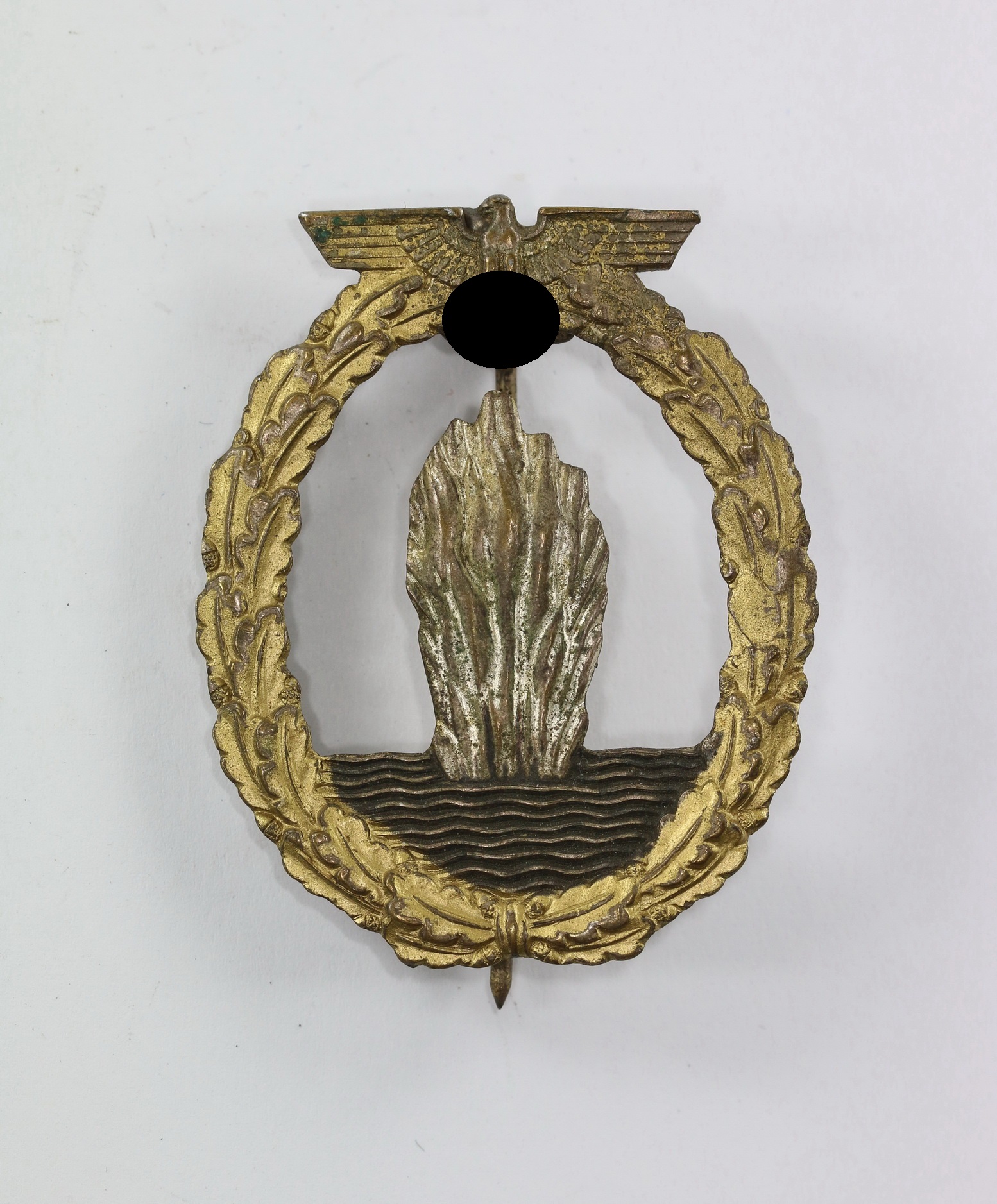 Zinc based and apart from some strengthening solder around the original hinge in a very good, slightly worn condition. The wreath with practically all of the gilt plate. The explosion with all of the silver plate and some patina.