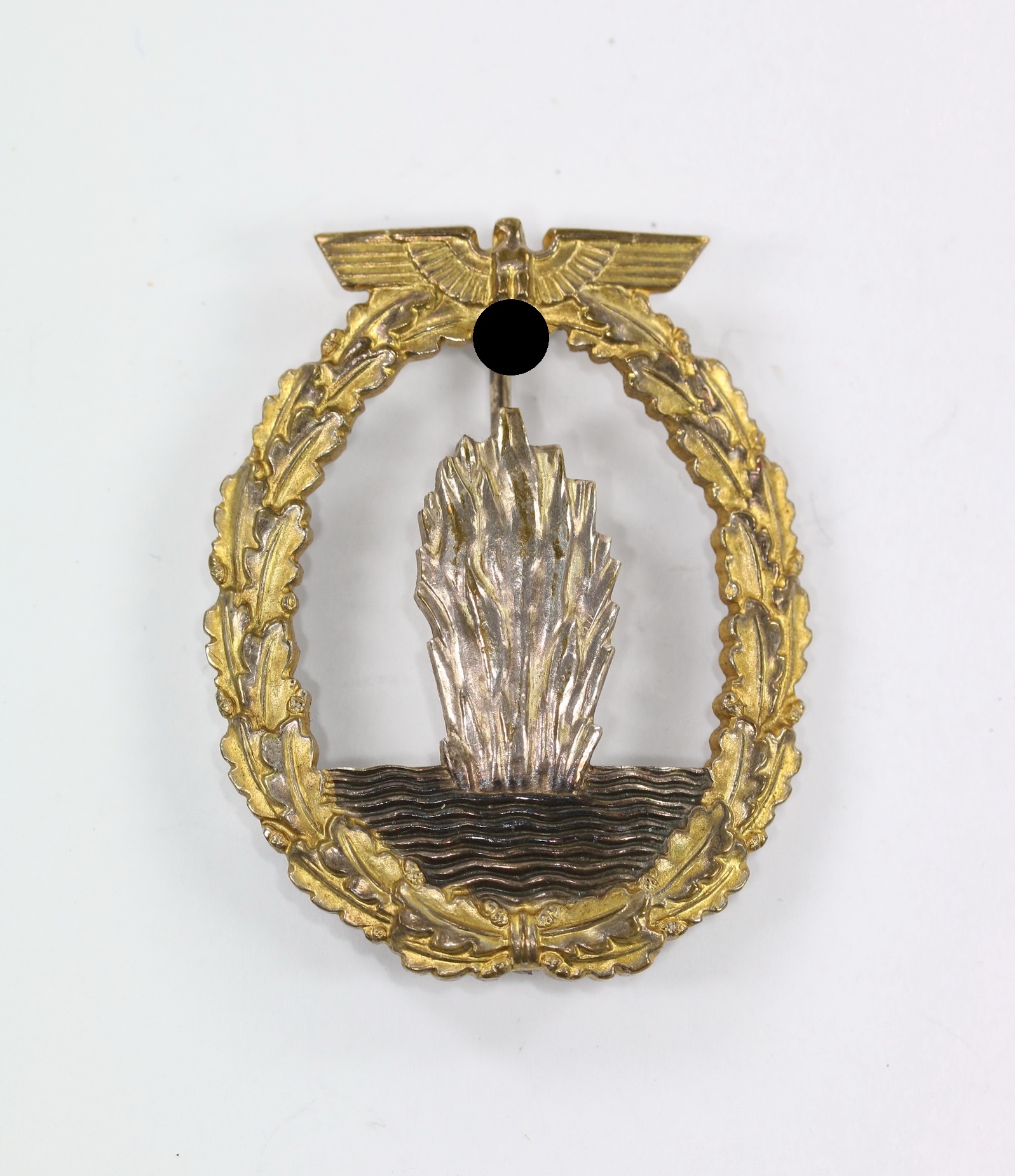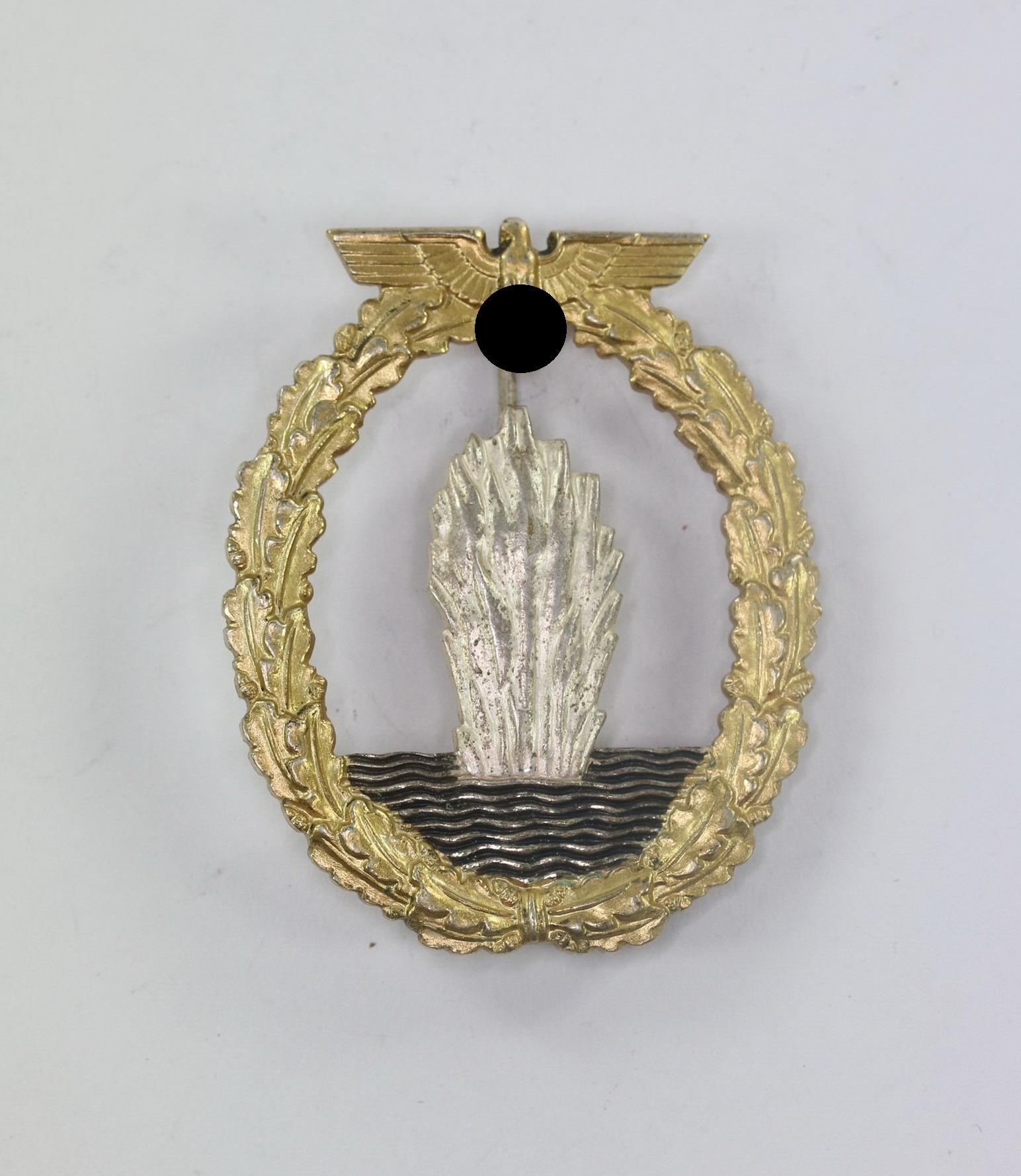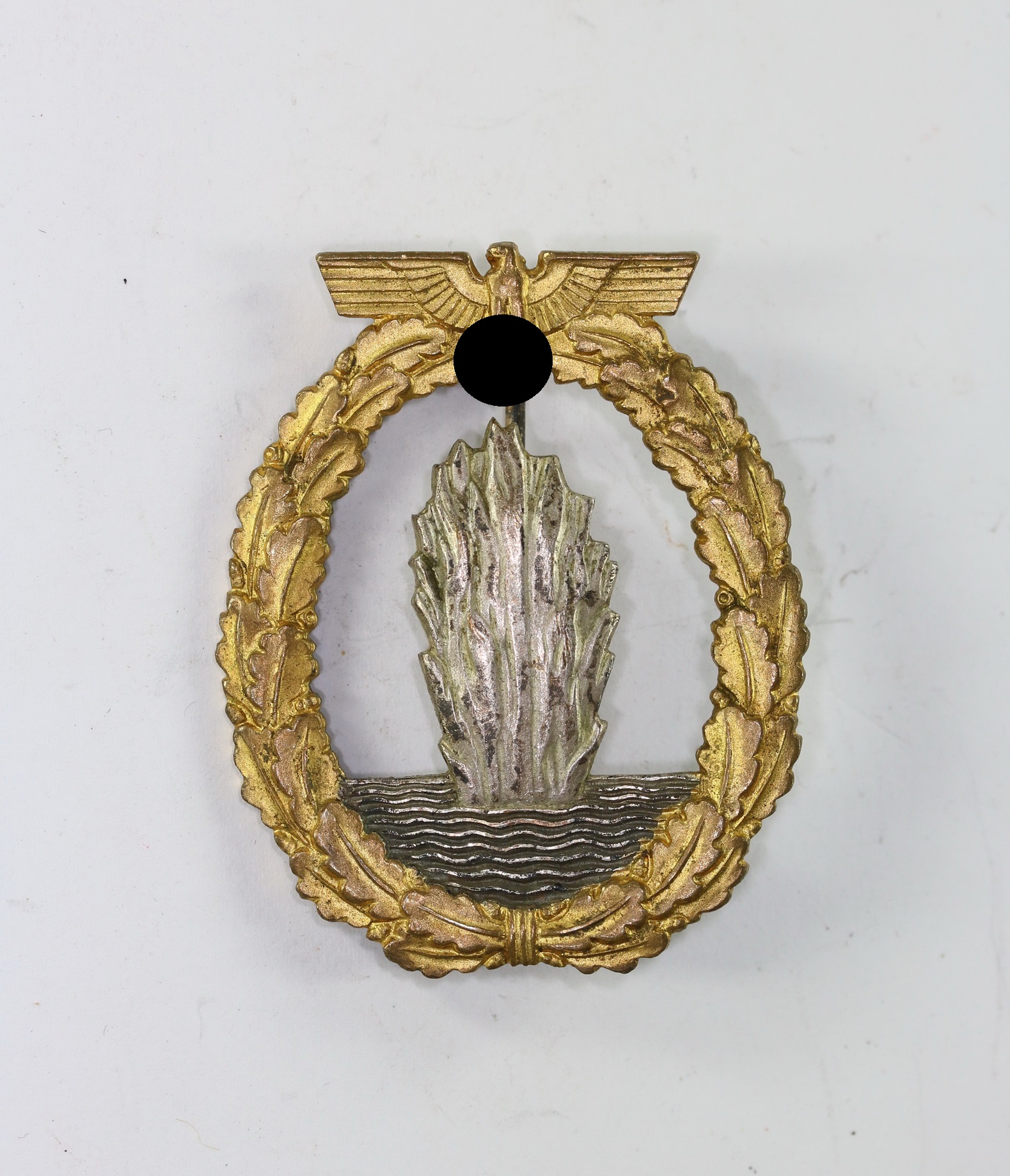 Tombak/brass based and in a very good, barely worn condition. The wreath with practically all of the gilt plate. The explosion with all of the silver plate and some patina. The waves dark oxidised.