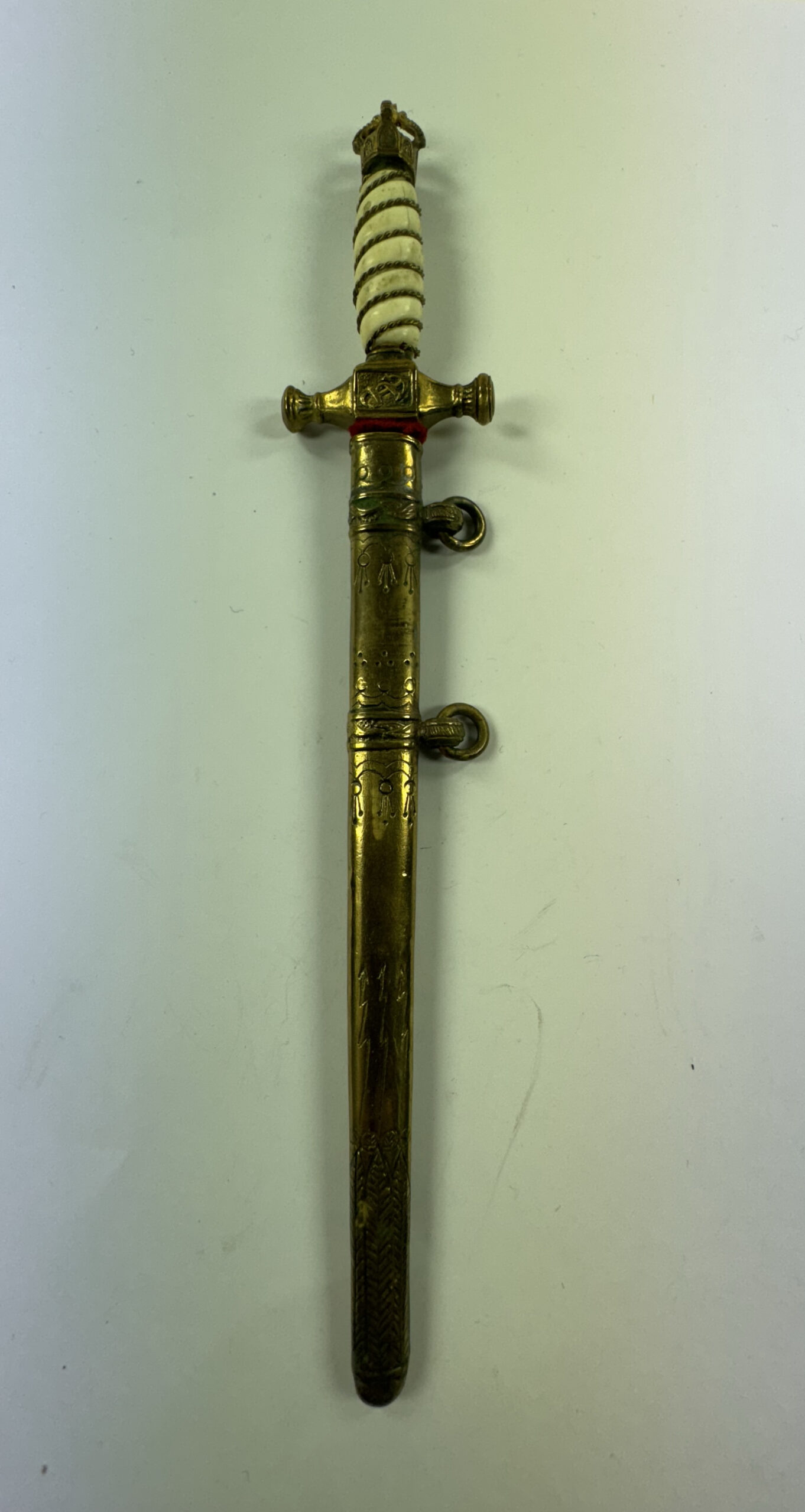 Metall, sehr guter, leicht gebrauchter Zustand. Ohne Fehler, die Klinge blank. Die Scheide ohne Fehler. Gesamtlänge ca. 20,5 cm, Klingenlänge ca. 11,2 cm.