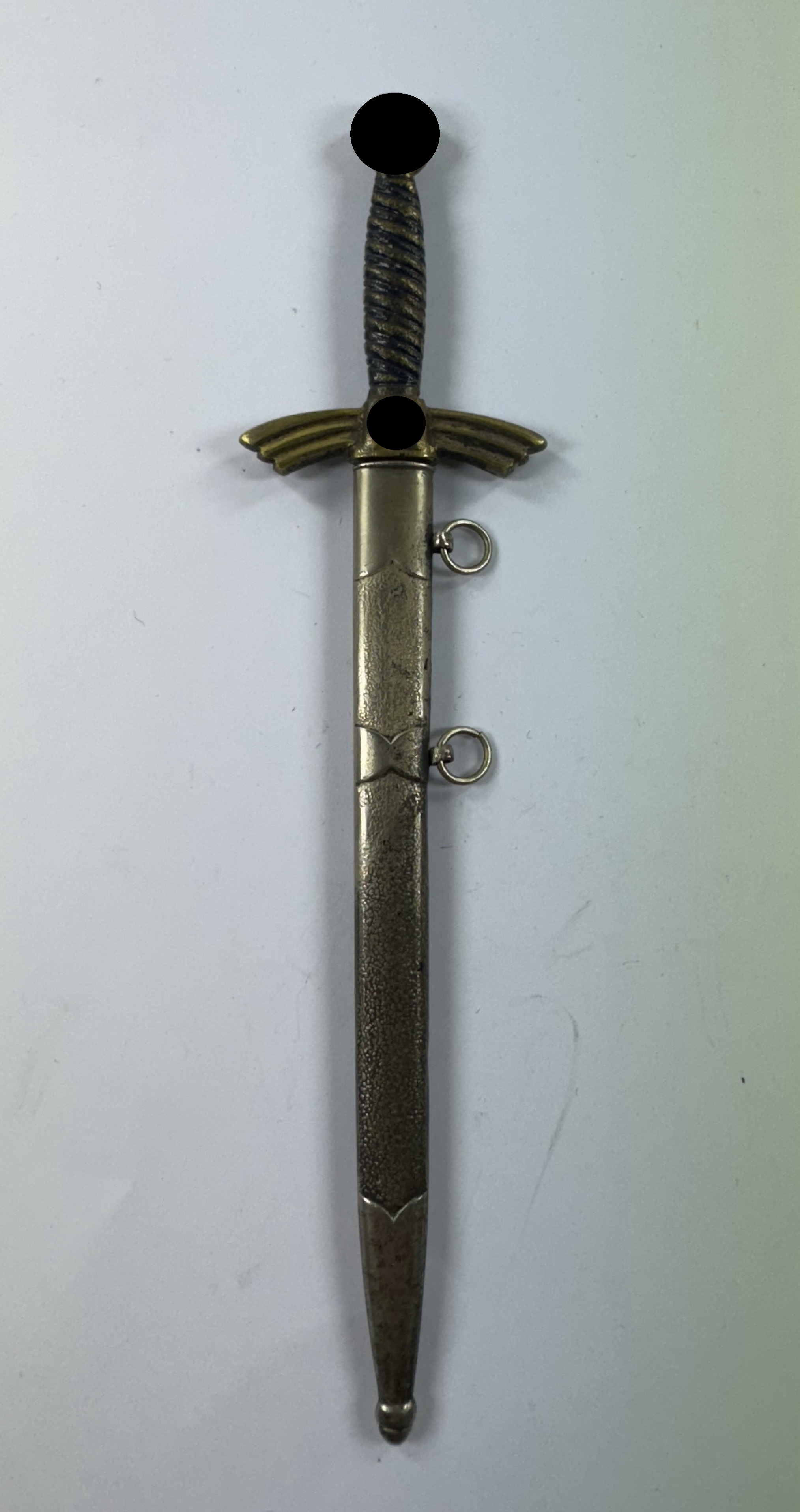 Metall, sehr guter, leicht gebrauchter Zustand. Ohne Fehler, die Klinge blank. Die Scheide mit Resten der originalen Lackierung. Gesamtlänge ca. 19 cm, Klingenlänge ca. 13,5 cm.