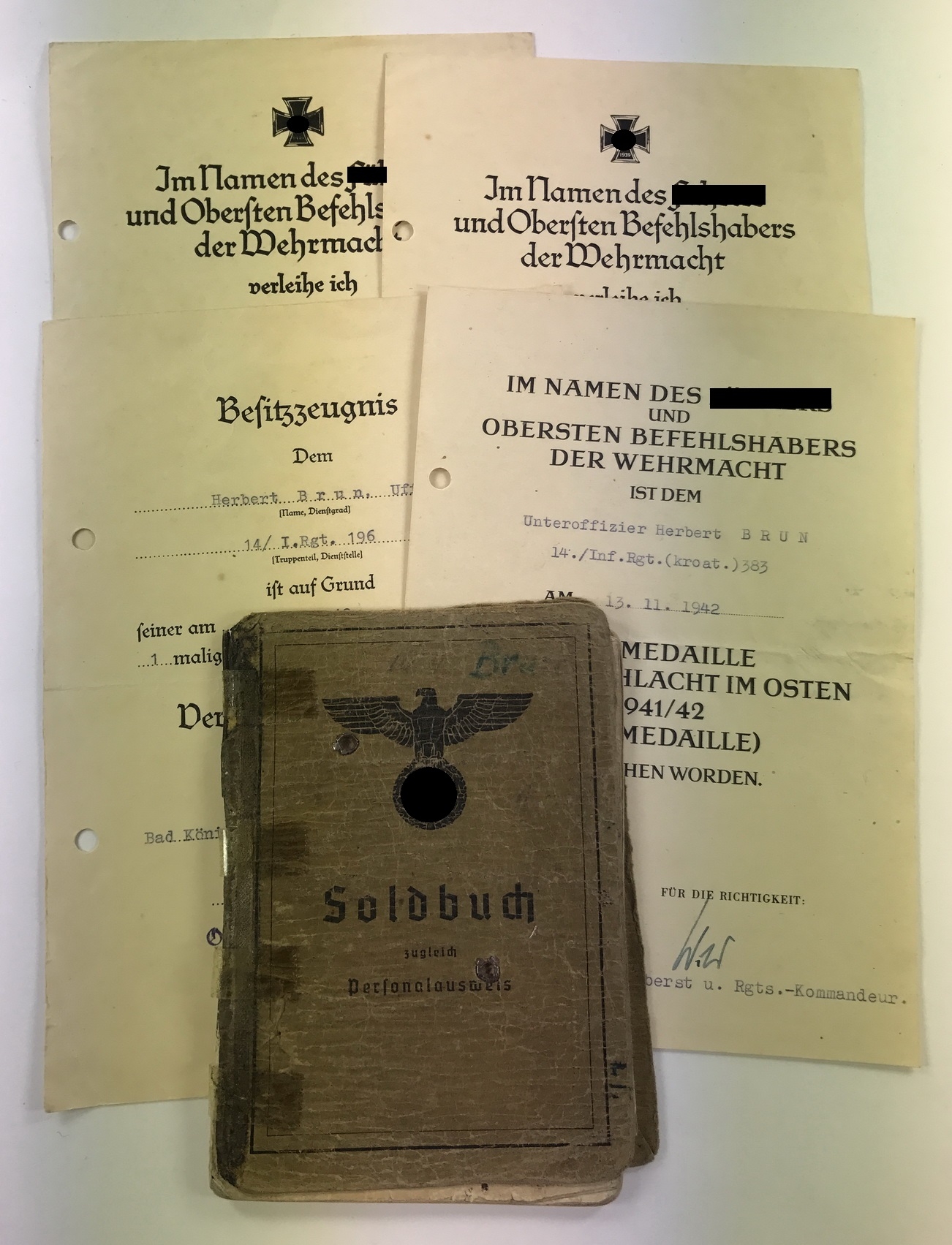 A group of documents belonging to the Unteroffizier Herbert Brun. Brunn served originally with Infanterieregiment 196. Later he was transferred to the Infanterieregiment kroatisch 383 as part of the German personal..