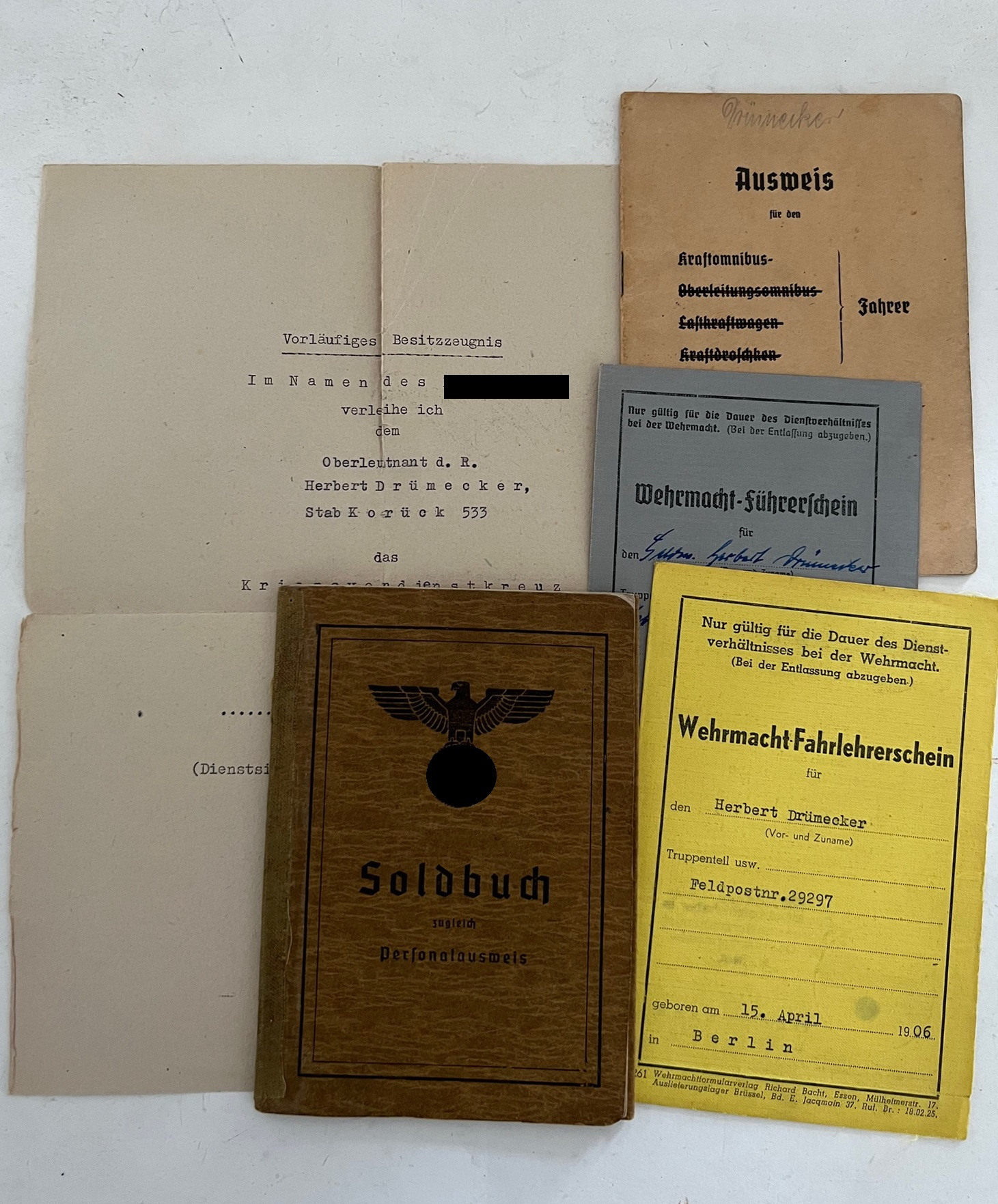 A group of documents from the possessions of the Oberleutnant Herbert Drümecker. Comprised of:
