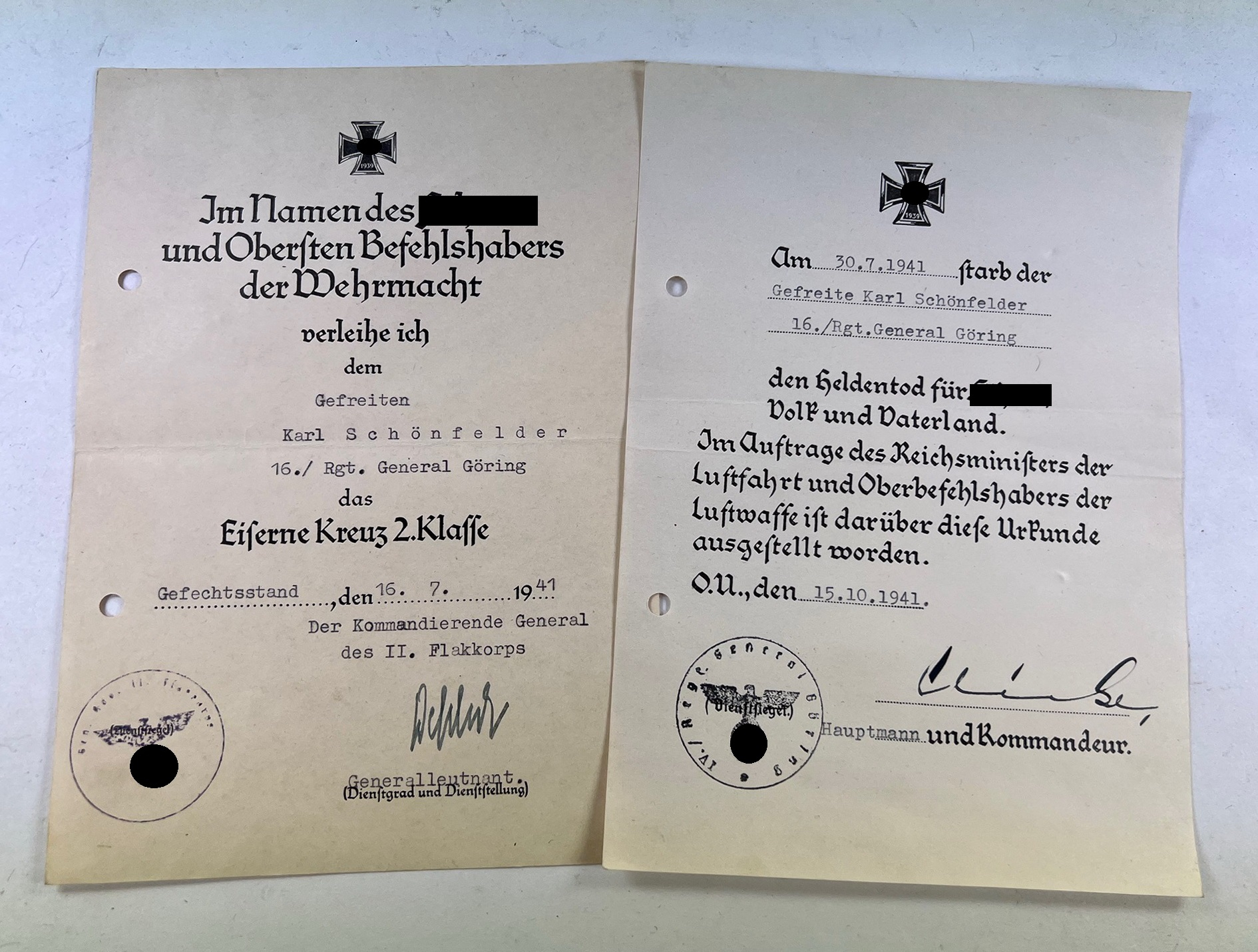 Two documents from the possessions of the Gefreiten Karl Schönfelder. Schönfelder served with the 16th Battery of Luftwaffen Regiments General Göring. Both documents in a good, slightly used condition.