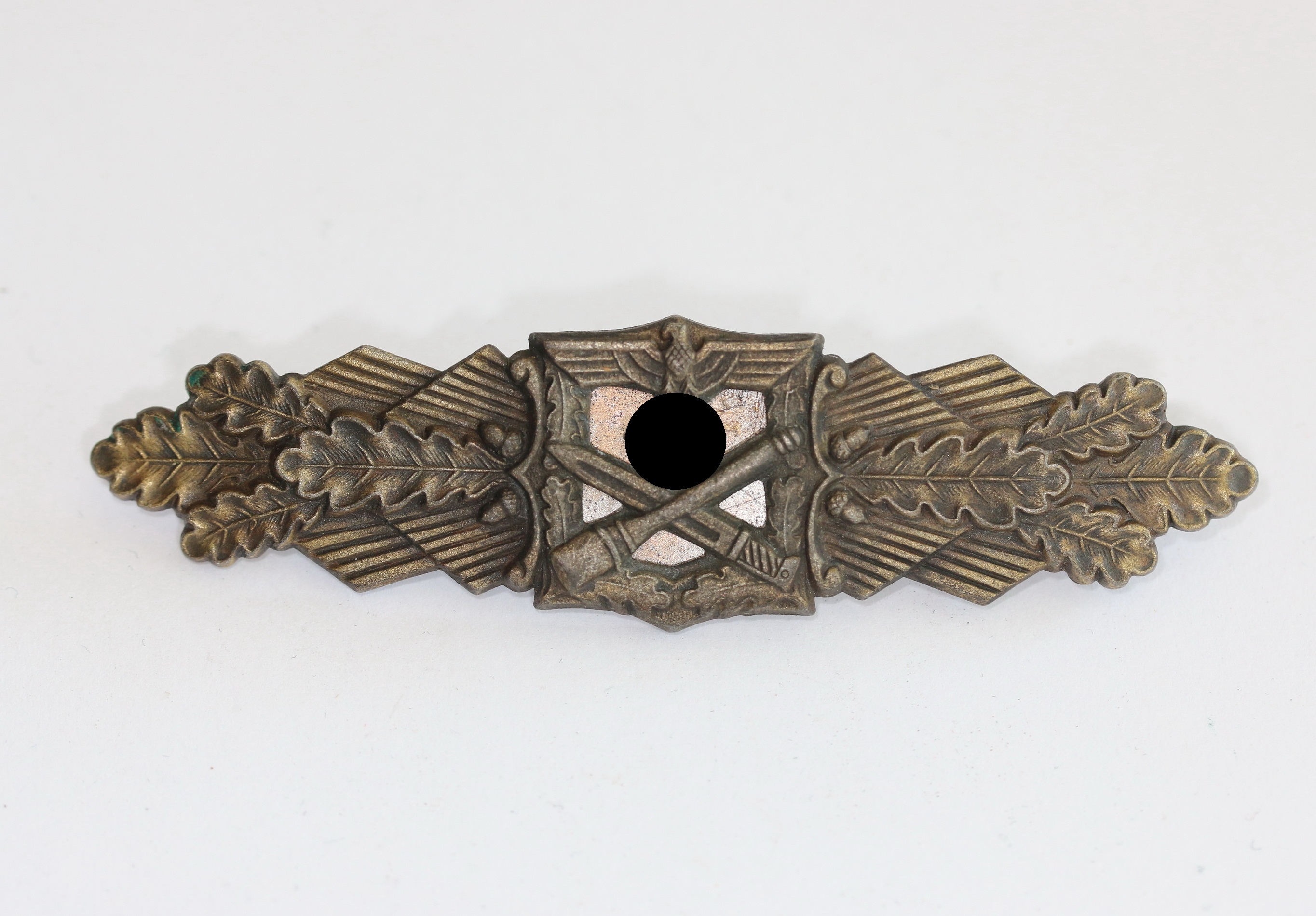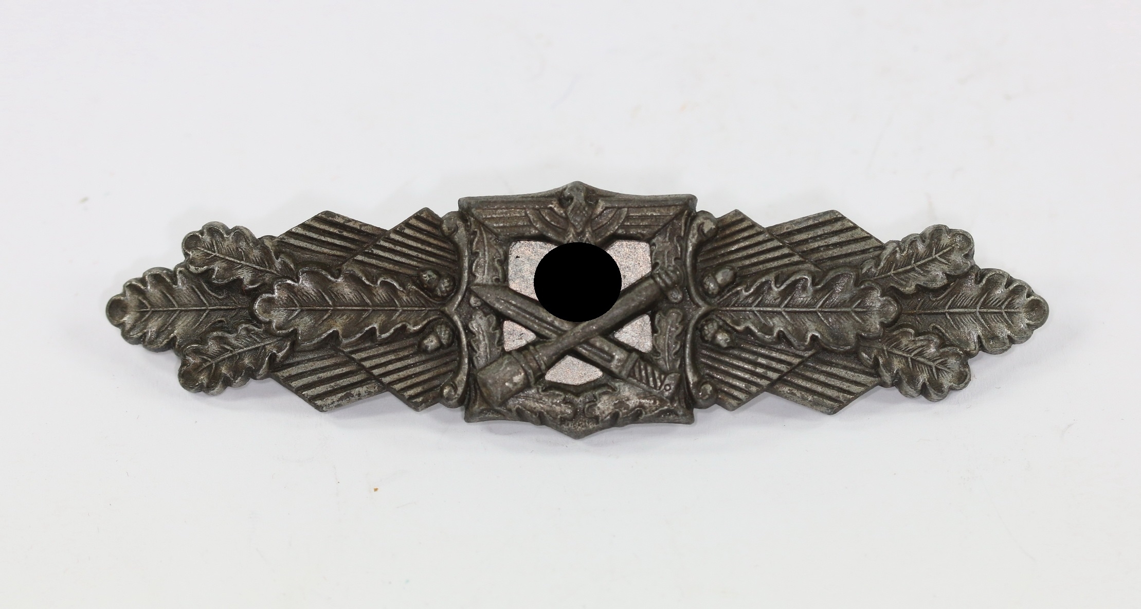 Zink, sehr guter, nahe zu ungetragener Zustand. Mit fast vollständiger Bronzierung. Das magnetische Plättchen mit vollständiger Tönung. Mit Hersteller „FLL“ für die Firma Friedrich Linden, Lüdenscheid. Siehe Thomas Durante, The German Close Combat Clasp, S. 190/191, Typ 1.14.2., 2. Modell!