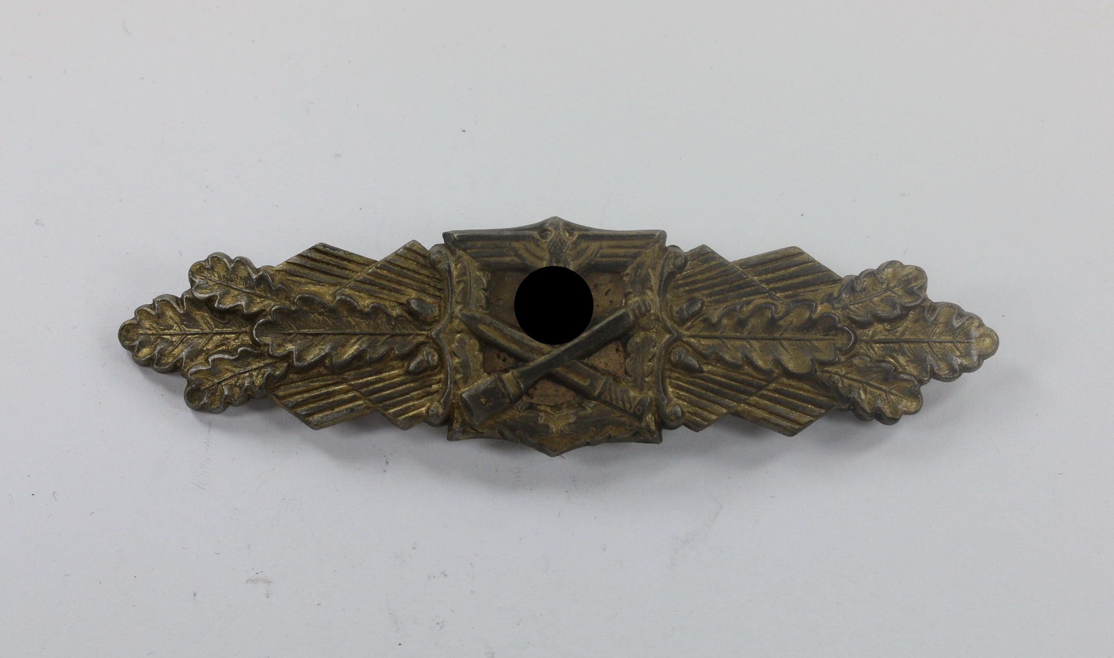 Zink, sehr guter, nur leicht getragener Zustand. Mit noch sehr schöner Bronzierung. Mit feiner Patina. Das magnetische Plättchen mit fast vollständiger Tönung. Mit Hersteller „FLL“ für die Firma Friedrich Linden, Lüdenscheid. Siehe Thomas Durante, The German Close Combat Clasp.