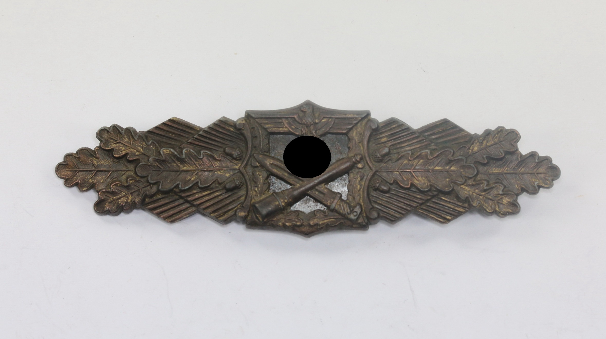 Zink, excellenter, ungetragener Zustand. Mit vollständiger, typischer Bronzierung. Das magnetische Plättchen mit vollständiger Schwärzung. Mit Hersteller „JFS“ für die Firma Josef Feix & Söhne, Gablonz. Siehe Thomas Durante, The German Close Combat Clasp.