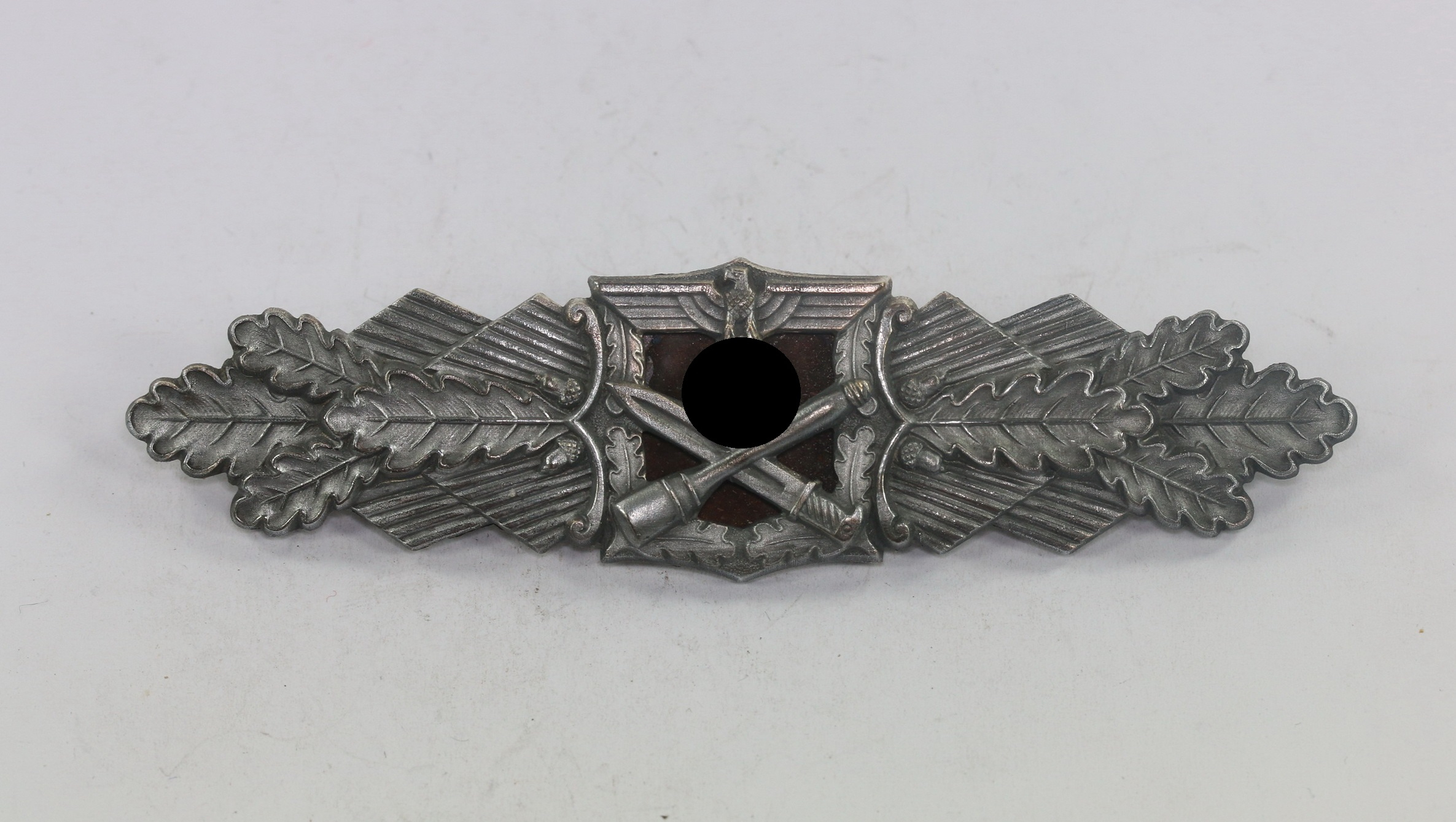 Zink, excellenter, ungetragener Zustand. Mit vollständiger Versilberung. Das magnetische Plättchen mit vollständiger Tönung. Ohne Hersteller, aber eine bekannte Variante der Firma Steinhauer & Lück, Lüdenscheid. Siehe Thomas Durante, The German Close Combat Clasp.