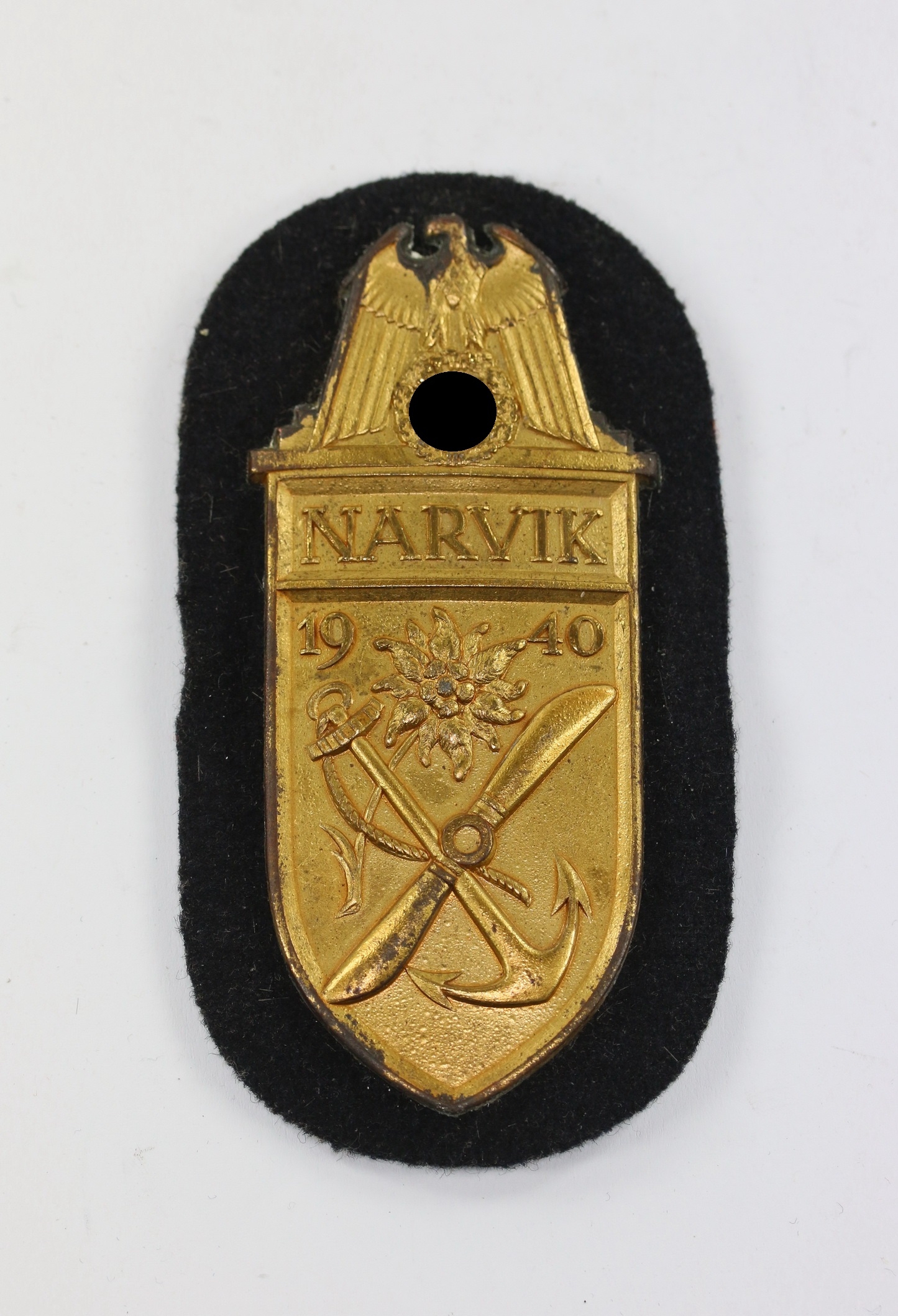 Zink, excellenter, ungetragener Zustand. Mit vollständiger Vergoldung. Ohne Hersteller, aber eine bekannte Variante, der Firma Wilhelm Deumer, Lüdenscheid. Vollständig mit allen vier Splinten, der Gegenplatte und der typischen Stoffabdeckung.