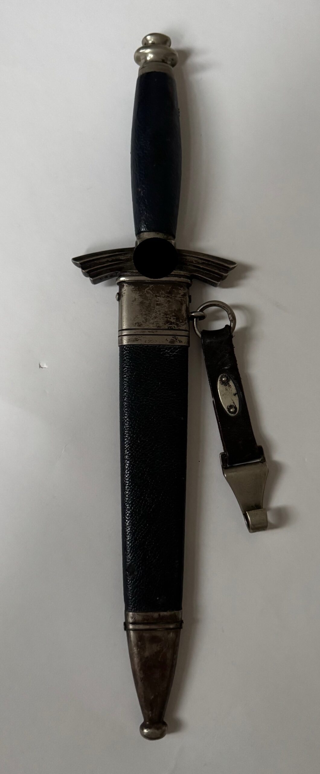 Die Scheide ohne Fehler, mit Neusilber Beschlägen und vollständiger, fehlerfreier Belederung. Auf den Mundblech der kleine NSFK Adlerr mit Hakenkreuz. Die Klinge blank und einwandfrei. Mit Hersteller Logo „SMF Solingen“.