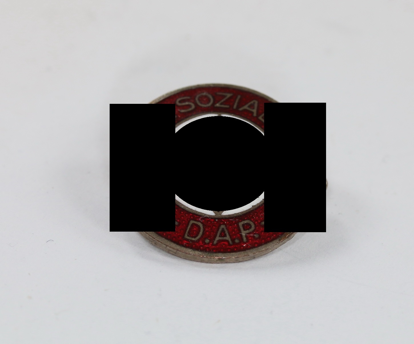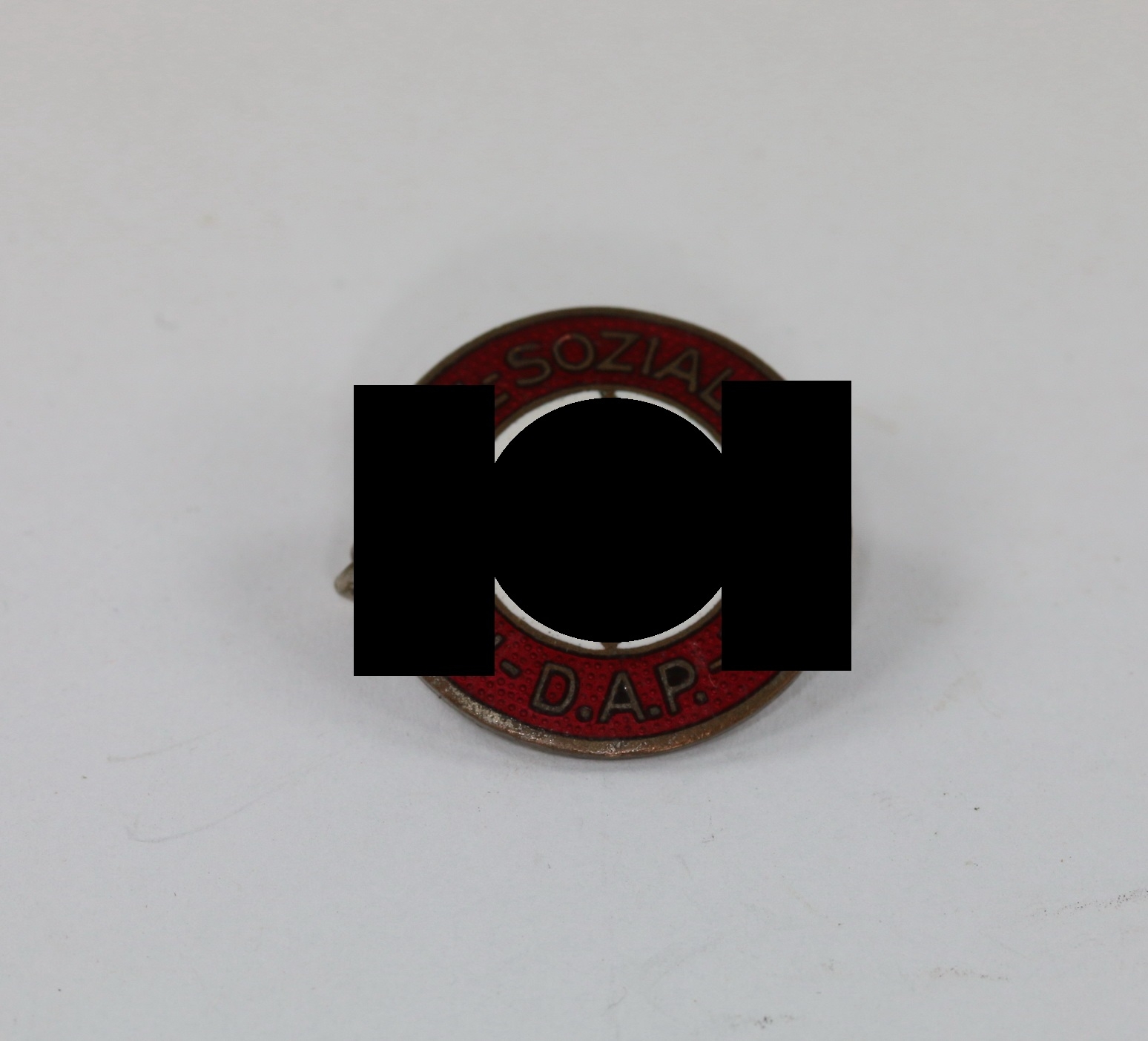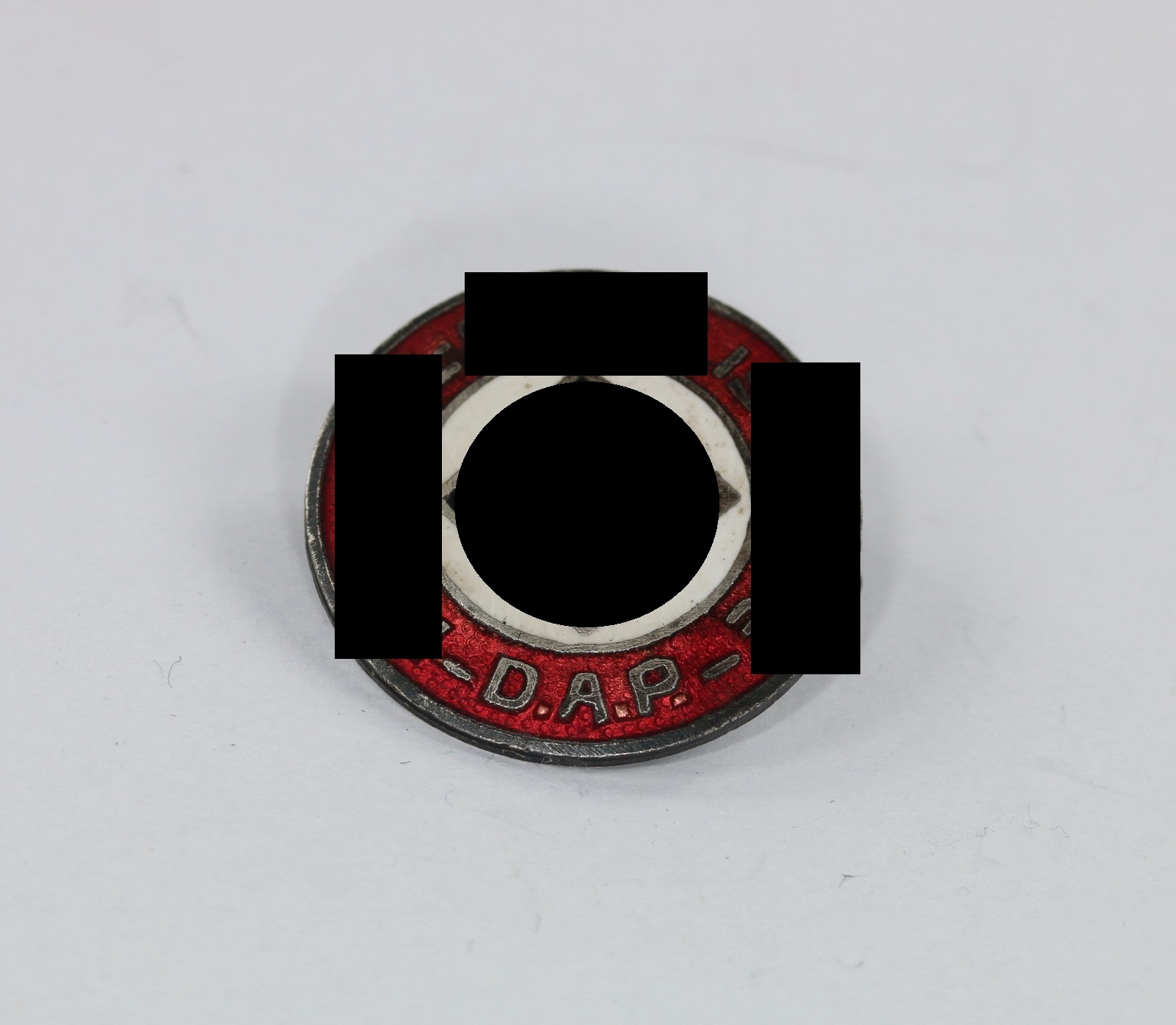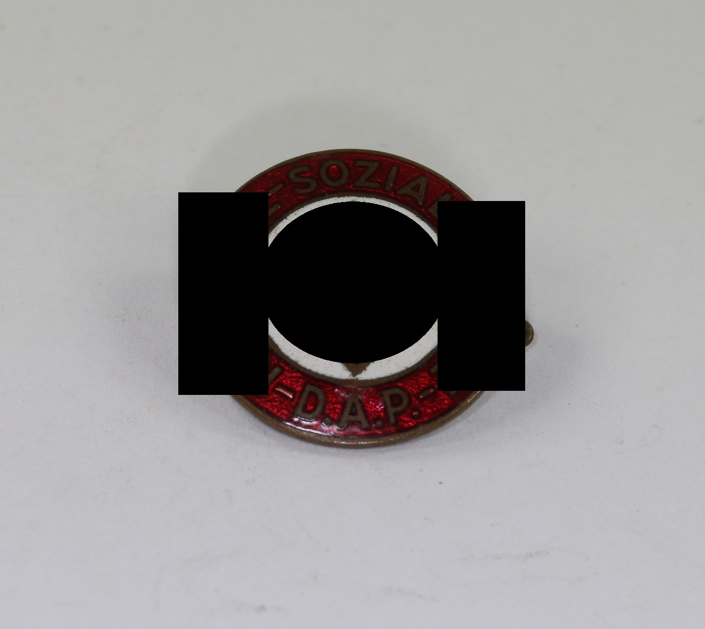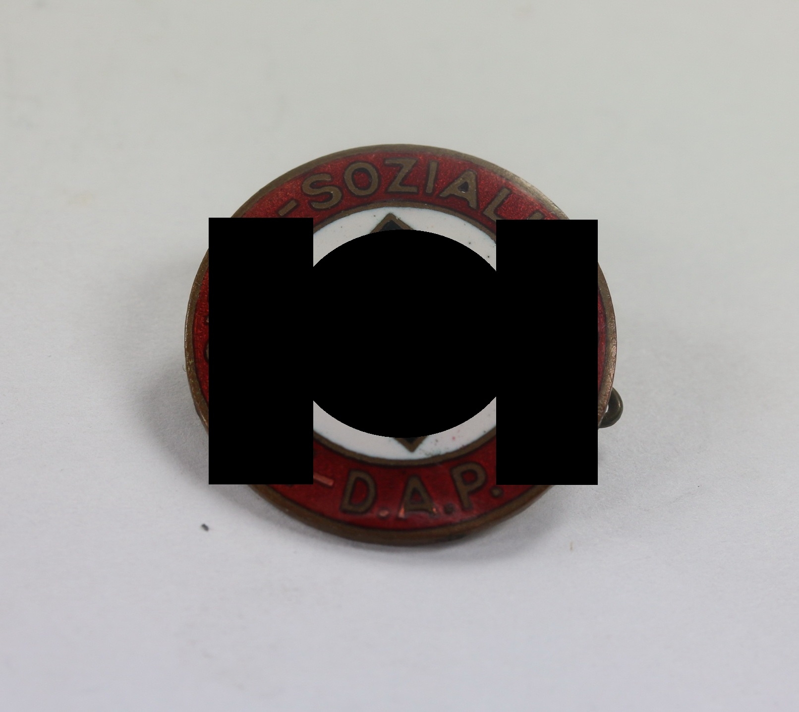 Buntmetall emailliert, sehr guter, nur minimal getragener Zustand. Die Emaille ohne Fehler. Markiert mit „Ges. Gesch.“.