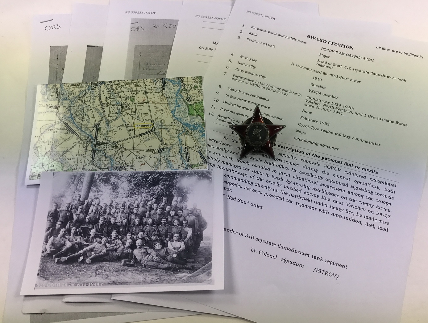 Komplettes Forschungsmaterial aus den russischen Archiven. Bestehend aus Registrierkarte, Auszeichnungsliste, Dekret und Verleihungsvorschlag. Das Vorschlag ins Englische übersetzt.