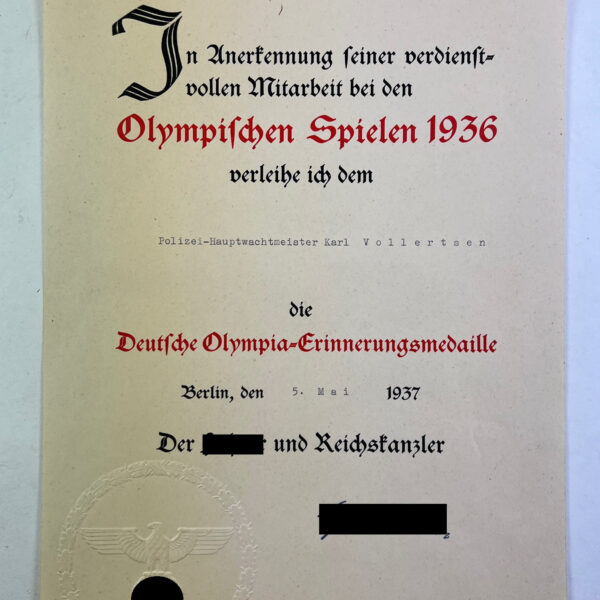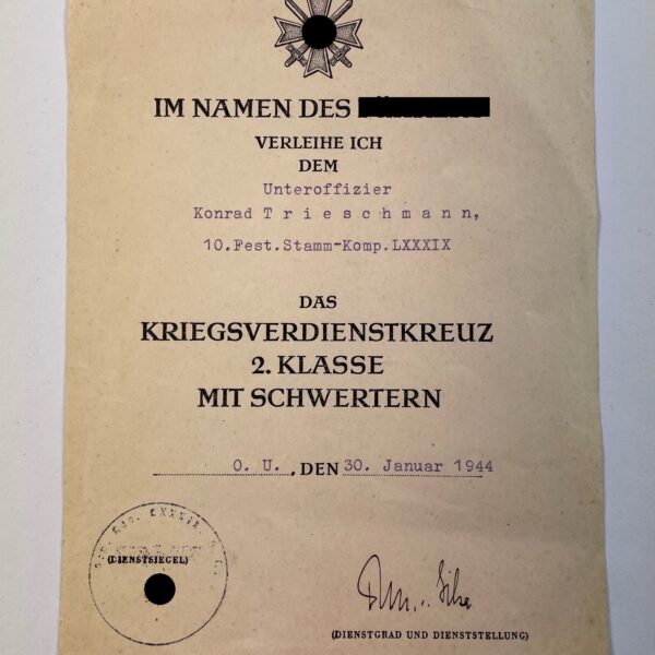 Urkunde Kriegsverdienstkreuz 2. Klasse mit Schwertern, Festungs Stamm Kompanie