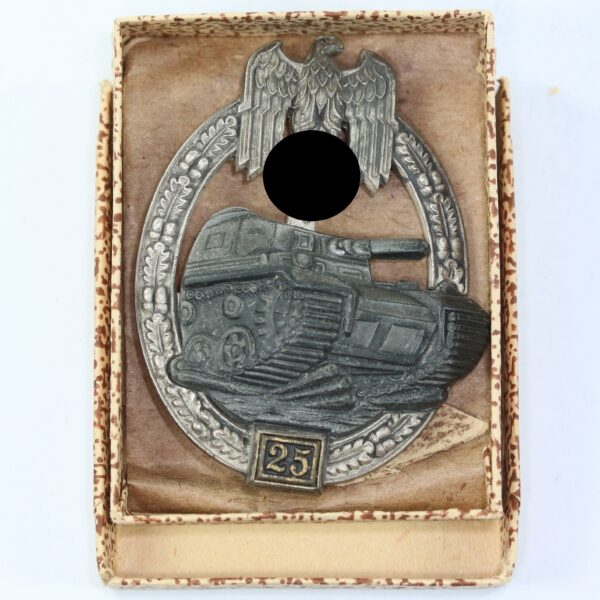 Panzerkampfabzeichen in Silber mit Einsatzzahl 25, JFS, in Verleihungsschachtel