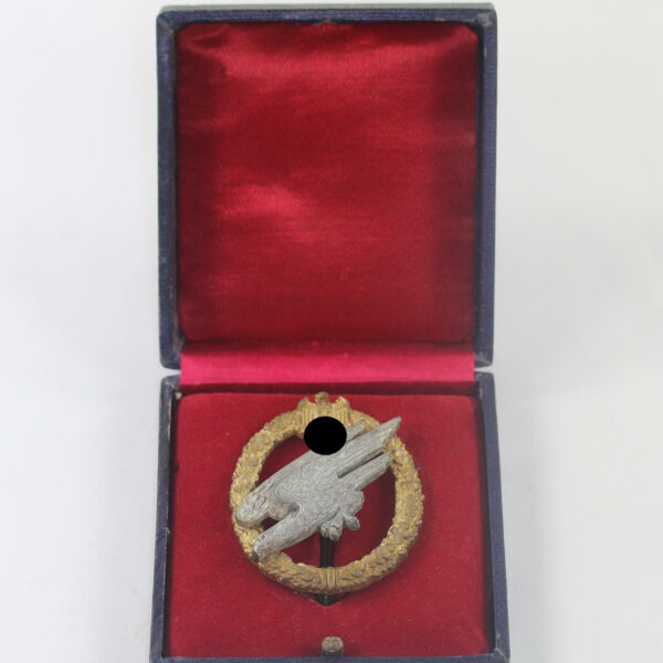 Fallschirmschützenabzeichen des Heeres, C.E. Juncker, im Etui mit roten (!) Inlet