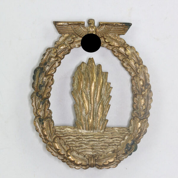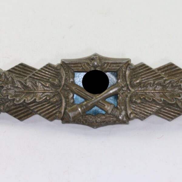 Nahkampfspange in Bronze, Hst. A.G.M.u.K., blaue Platte, goldene Nadel (!)