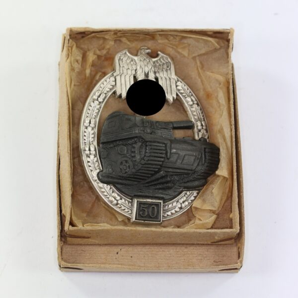 Panzerkampfabzeichen in Silber mit Einsatzzahl 50, JFS, in Verleihungsschachtel