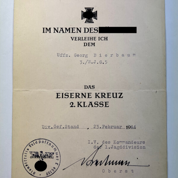 Urkunde Eisernes Kreuz 2. Klasse 1939, Nachtjagd Geschwader 5 (N.J.G.5)